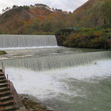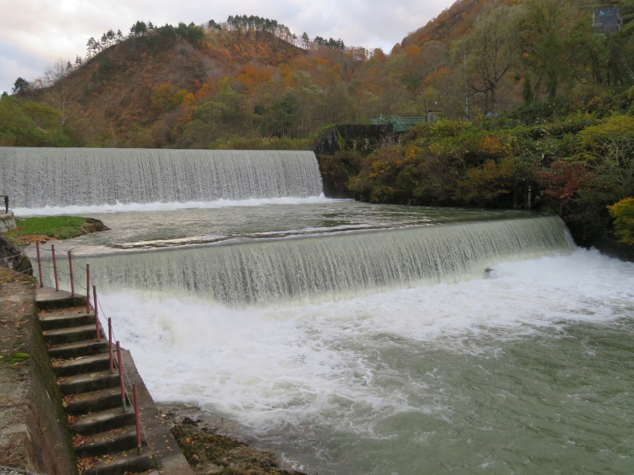 温泉街の南のはずれの川沿いに源泉公園というのがあり、そこに肘折ダムという堰堤がある。昭和27年に造られたもので、国の登録有形文化財だそうだ。手前に団子屋があったのだが、売り切れになっていて食べそこなった。公園には源泉ドーム、初恋足湯などがあり、そこから肘折ダムが眺められる。滝のような感じで銅山側の清流が流れ落ちていた。温泉街の散策ついでに立ち寄るのにちょうどいい。