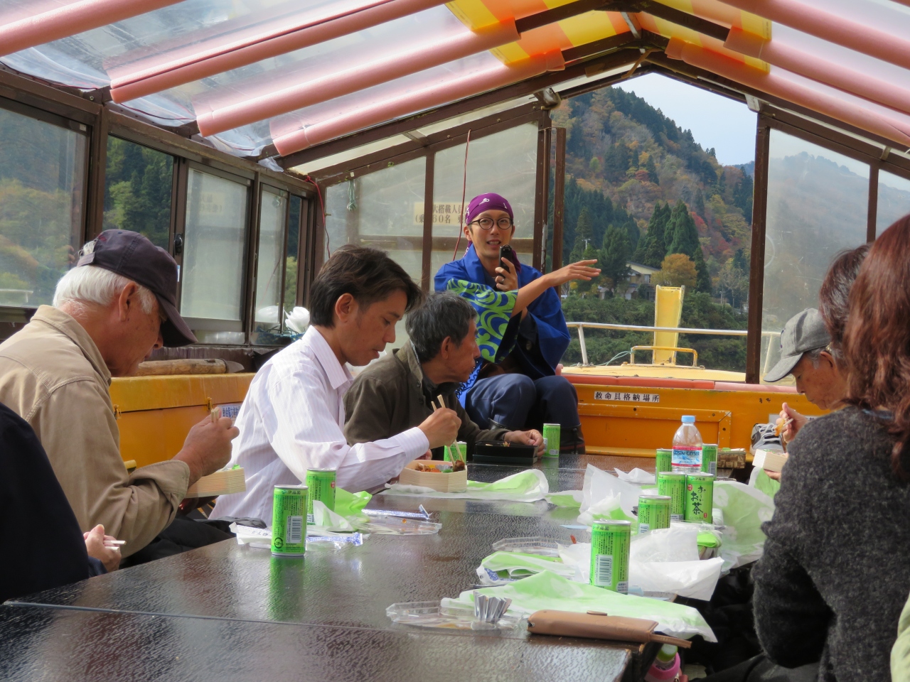 JR陸羽西線の古口駅から5分くらいのところに戸澤藩船番所というのがあり、そこから船に乗った。3航路ある中の、定期航路にした。乗船料金は大人2200円。12kmで約一時間の舟旅。さだまさしに似た船頭さんの軽妙な口上がよかった。雨のせいで川の水量がやや多かったが、紅葉がきれいだった。ちょうど中ほどでふるさと村という水上コンビニに立ち寄った。だだちゃ豆アイスというのがあり、おいしかった。
