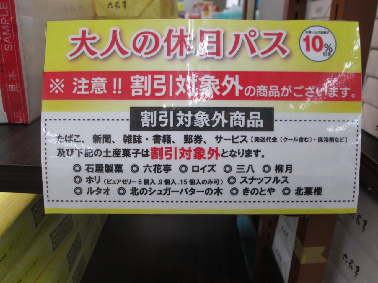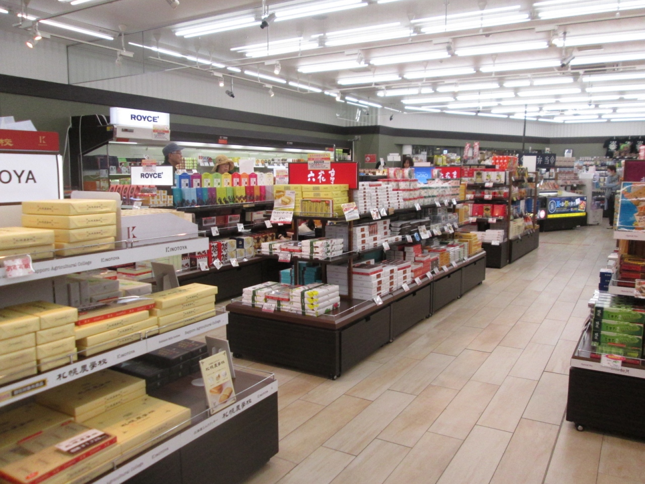 土産用のお菓子やお酒、海産物などの他に鉄道グッズも扱っていますが、特にお菓子は定番の白い恋人やマルセイバターサンドはじめ品揃えは豊富です。なお「大人の休日パス」提示で10%割引になりますが、石屋製菓、六花亭、北菓楼などの有名メーカー品は割引対象外のため、買ったお菓子のほとんどは無割引でした。