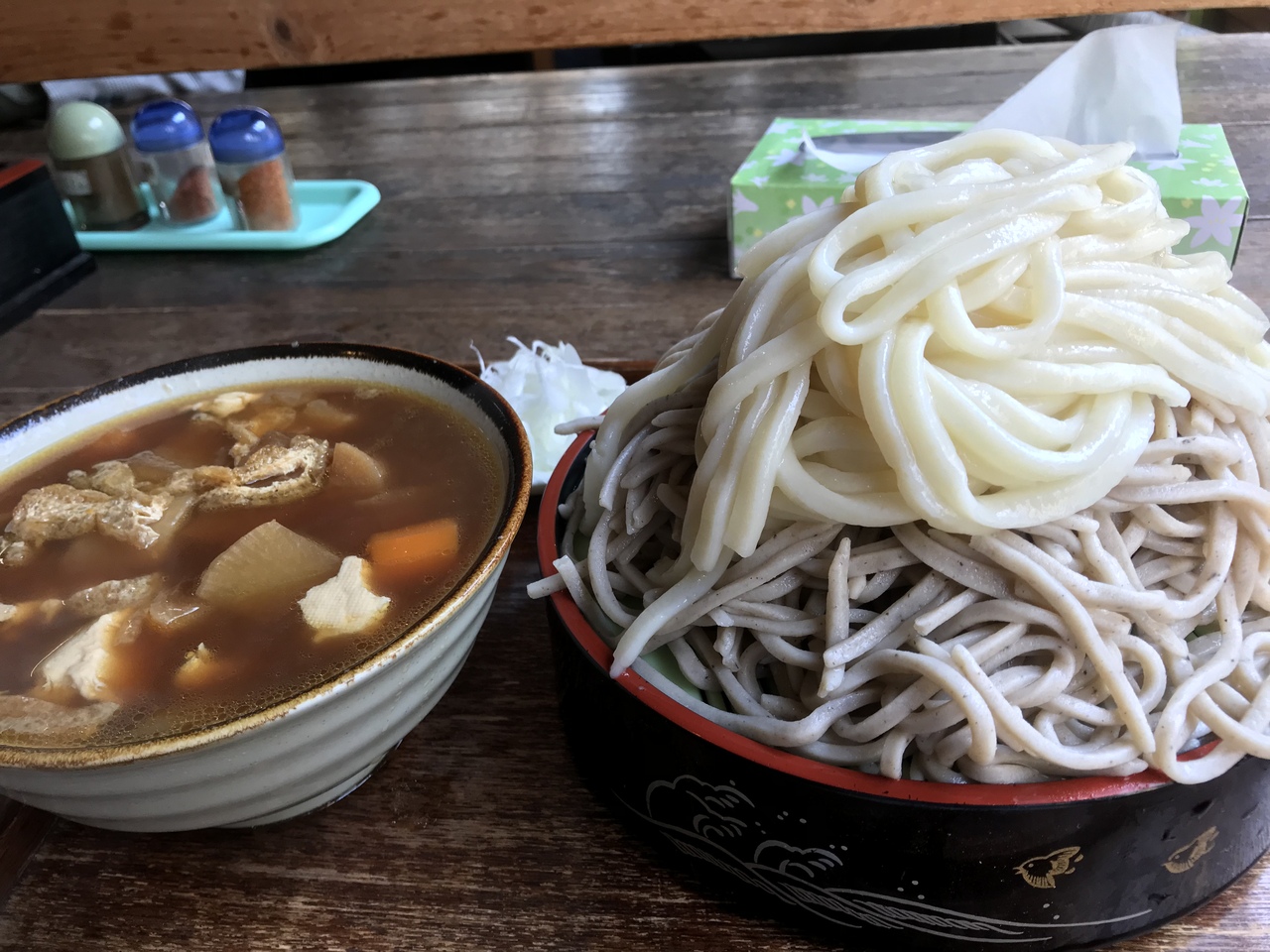 JR水戸駅から徒歩10分ぐらいの場所にある側の店です。一見怪しげなビルの2階にあり入るときには勇気がいりますが、中に入ると元気のいいオヤジさんの挨拶で迎えてくれます。熱々のけんちん汁に蕎麦かうどんをつけて食べます。量はかなり多いので、大盛りにするとなかなか食べきれないかもしれません。大盛りにするとけんちん汁がお代わりできます。大盛りにするとけんちん汁の香りが可能です。このけんちん汁が熱々で野菜たっぷりで美味い!そばの大盛りができなかったので、うどんとそばの相盛りにしてくれました。
