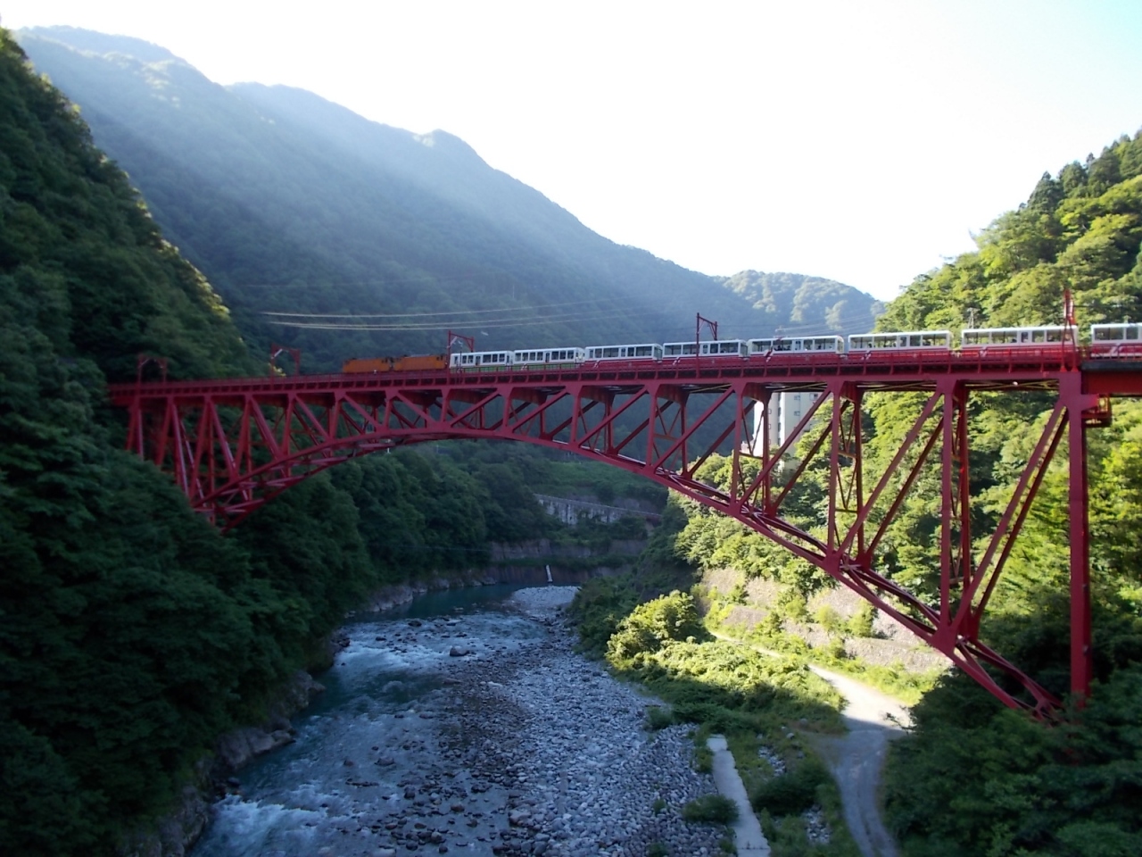 宇奈月駅を出たトロッコ列車が最初にわたる鉄橋で、遊歩道になっているやまびこ橋より少し上流側のやや高いところに架かっています。鉄橋をわたるトロッコ列車が、山彦橋ややまびこ展望台からよく見えます。「やまびこ」という名前の由来は、鉄橋をわたる列車の音がやまびこのように鳴り響くからだとか。