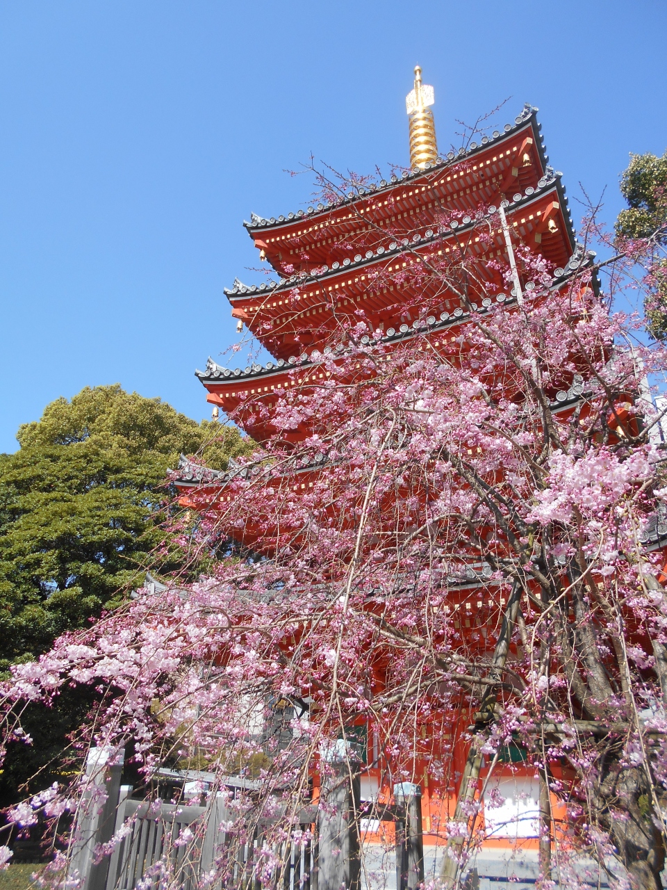 ちょうど桜が満開になる時期だったので、東長寺の境内はたくさんの人でにぎわっていました。境内にそびえる朱色の五重塔は白砂に映えてとても立派に見えました。搭の前には枝垂桜が花をつけていて、ここで記念撮影をする人が多かったです。