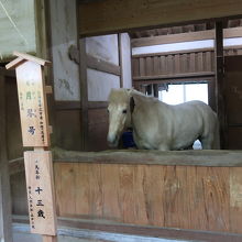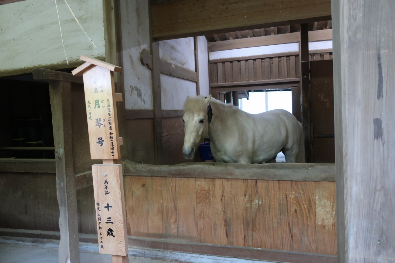 金刀比羅宮の石段を登って429段目、桜馬場西詰銅鳥居の左手の広場の先にある平屋の建物が金刀比羅宮 御厩です。神様が乗る馬である神馬を飼育する厩が御厩です。良く見かけるのは馬の像が置かれている神社が多いのですが、ここには本物の白馬、月琴号が居り、結構人だかりができていました。13才の可愛い馬ですが、ここまでわざわざ連れて来るとは凄いです。
