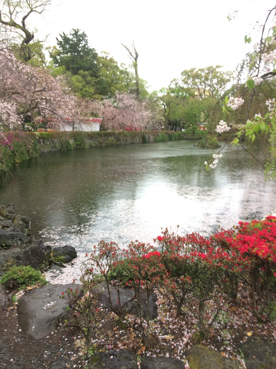ピンクと赤の色彩が印象的な花に囲まれる池も素敵でした。