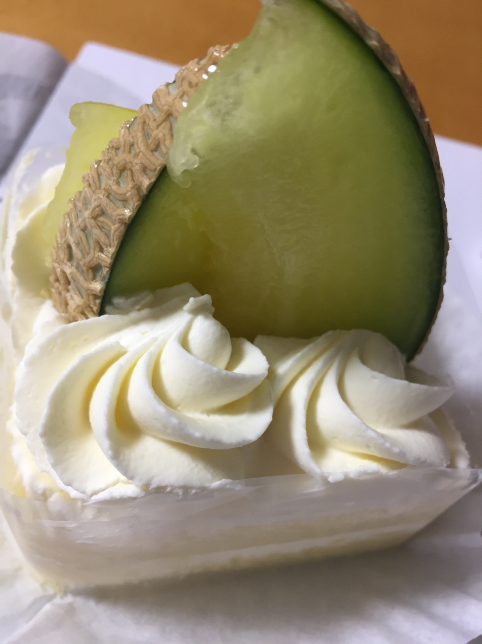 旬のフルーツを使ったケーキを販売しているお店で今回はメロンのショートケーキを購入しました。スポンジがふわふわでクリームは普通の物より甘く感じました。スポンジの間にはメロンが挟まっていましたが多くはありませんでした。上に乗っているメロンは甘く美味しかったです。皮付きだったので少し食べにくかったです。