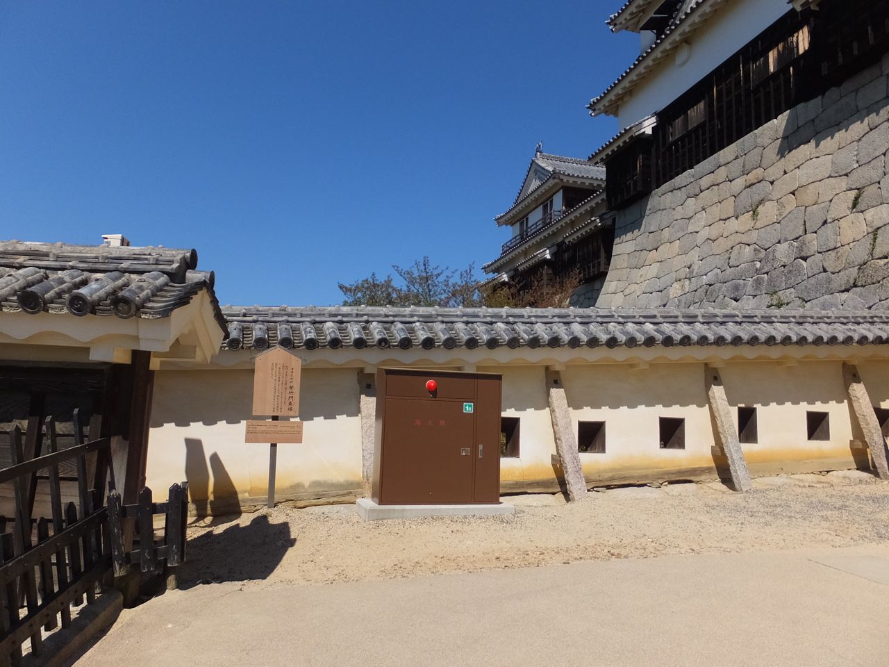 ロープウェイ側から来ると通らないのですが、古町の方の裏側からくると天守の裏の乾門を通って、紫竹門に来て、ここから天守の一の門に入ります。その紫竹門まで来た敵を横から攻撃するための塀で、攻撃用の穴が並んで開いています。通常だと中側(城内側)から見ることになるので、ただの壁にしか見えず見落としがちです。料金所を入ったら最初のみどころなので注意が必要です。