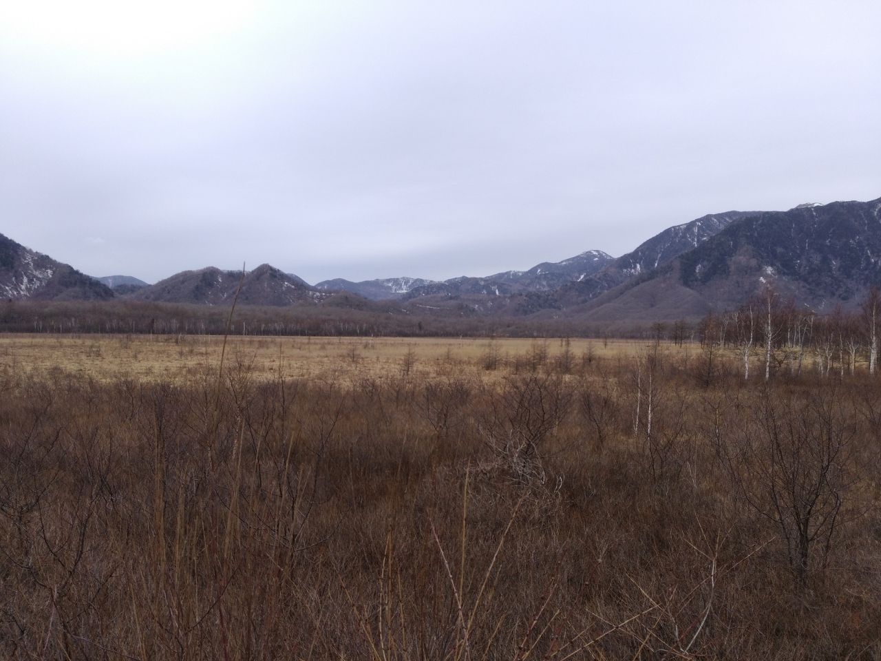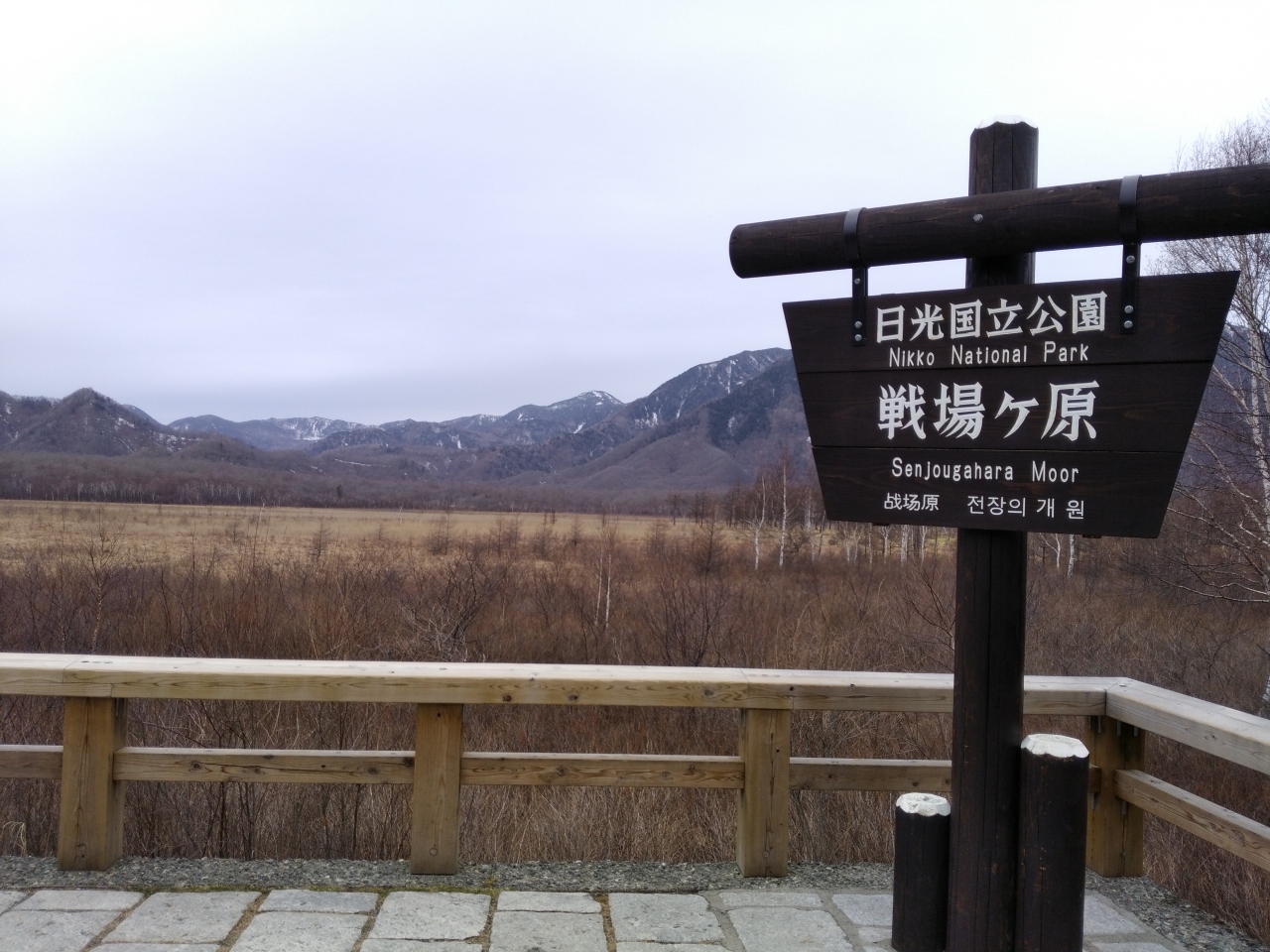日光から中禅寺湖を通り、日光ロマンティック街道を奥日光に向けて走りますと、戦場ヶ原を通ります。戦場ヶ原の展望所の対面にある駐車場に車を停めて展望所に向かいました。当日は天気が悪く、まだ肌寒い日だったせいか、お客様もほとんどなく、とても寂しい場所でした。天気が良かったら印象が違うのでしょうが、たんなる原っぱに見えました。