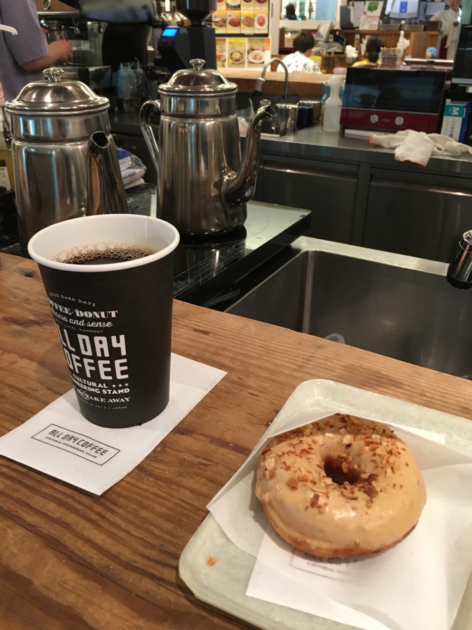 グランフロントでお買い物の途中に休憩で訪れました。カウンターのみの気軽に立ち寄れるお店で、もう何度も再訪しています。ハンドドリップのオリジナルブレンドコーヒーとピーナッツバターのドーナツをいただきました。注文を受けてから淹れてくれるコーヒーは飲みやすく、たっぷりサイズで美味しいです。