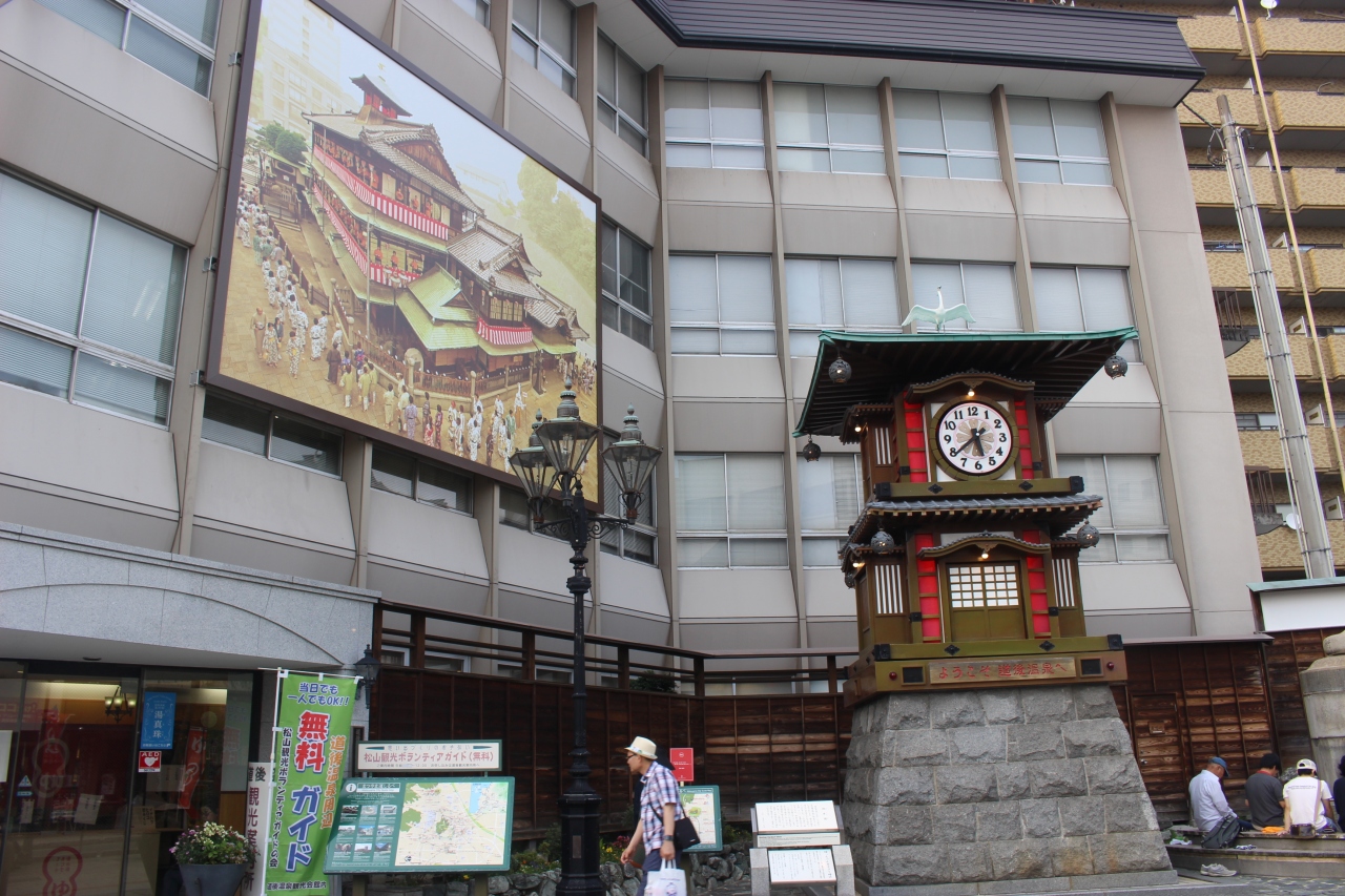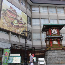 駅前にはバス乗り場、ローソン、道後温泉へのアーケードの入り口などがありますが、この坊ちゃんからくり時計もあります。