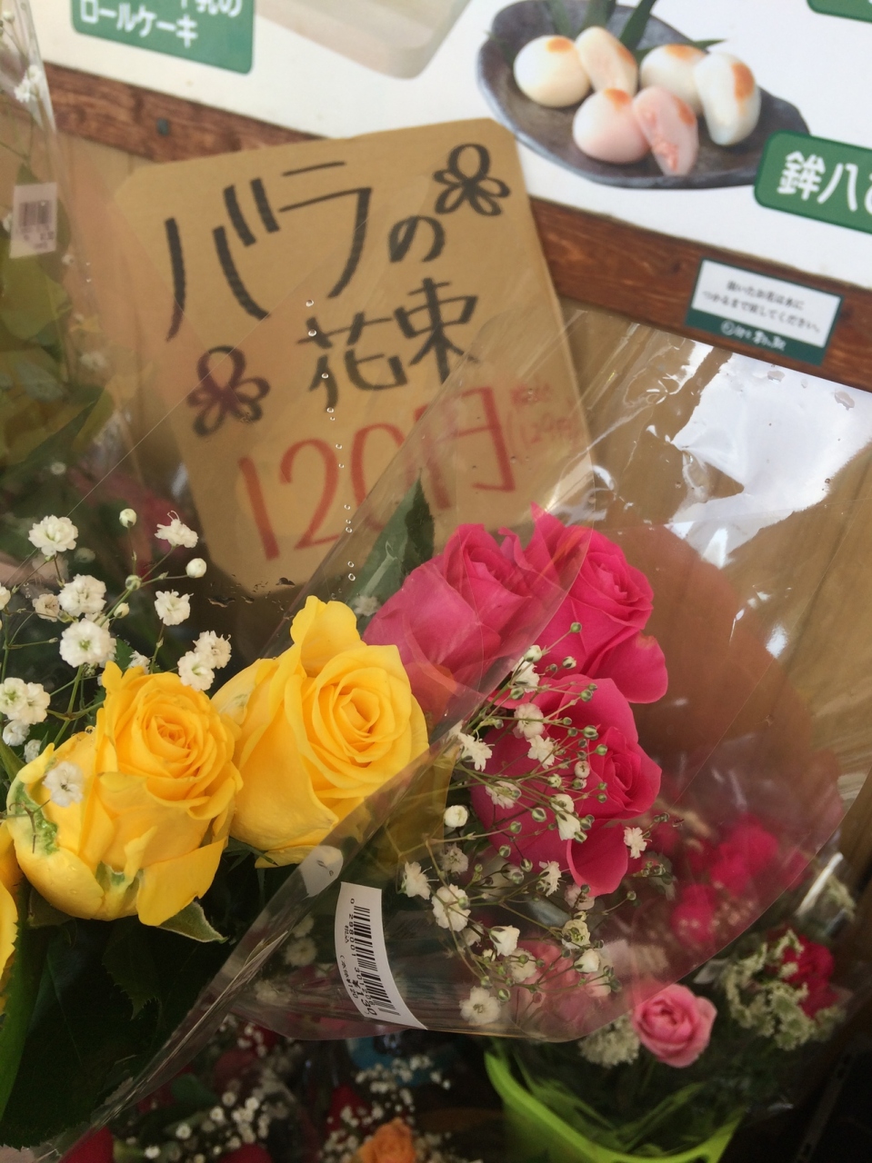 ピンクと黄色のバラの花束をひとつずつ購入。
