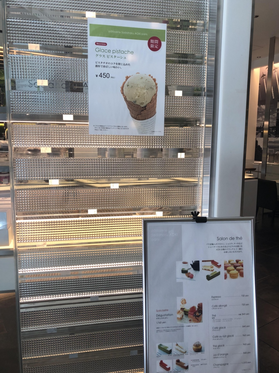 六本木ミッドタウンに入っているサダハル・アオキ。いつのまにかイートインスペースが狭くなってしまいましたが、今はテイクアウトにも力を入れているようで、期間限定のピスタチオアイスの案内がありました。