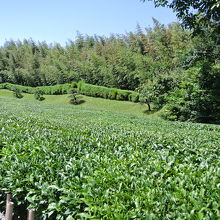園の北側にあります。思っていたよりも大きな茶畑でした。季節がら葉も青々としていて、丸刈りのお茶の木が続く景色はとてもきれいでした。すぐ横に茶店があって、その店内から、茶畑を見ながら、冷たいお茶を飲んで一服して、ほっこりしました。