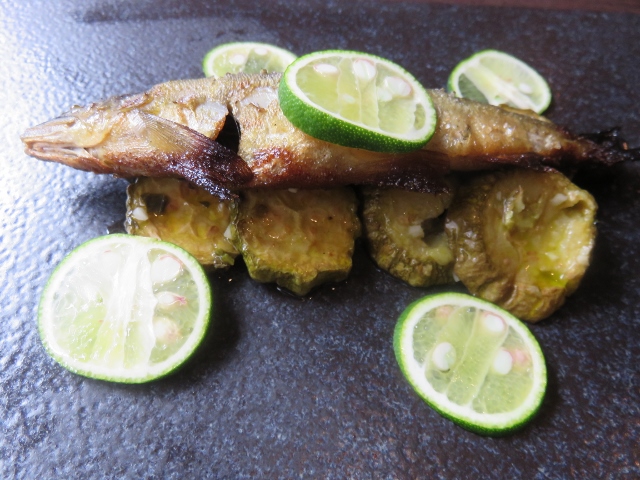 鮎の小骨の多さ気にならないほど、外側は香ばしいのに、中身はふんわりと滋養感じるうまさ、かんきつ類の付け合せがさらに、料理に清涼感あるテイストプラスしています