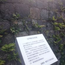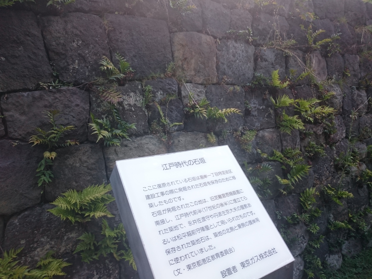 首都高速の渋滞多発エリアである浜崎橋JCTの下にあります。石垣は車の交通量は多い通りに面しているものの、歩行者は少ない場所でひっそりしていました。休日のためか浜松町からの歩行者は少なく寂しい雰囲気が漂っていました。江戸時代の大名屋敷に護岸目的で使われていた石が移設されたようです。