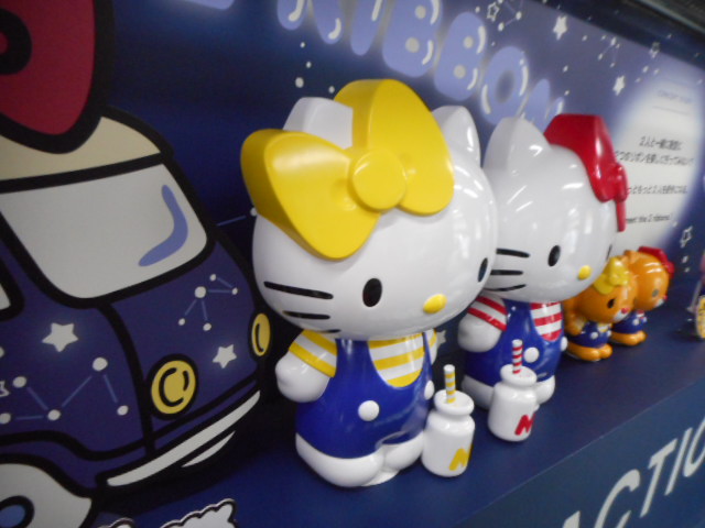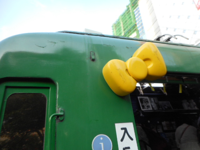 渋谷のハチ公前広場にある緑色の電車です。アオガエルと呼ばれる形だそうです。期間限定でハローキティバージョンになっていて、外観は電車正面にリボンがあったり、車中もキティと仲間たちの装飾になっていて、とってもかわいかったです。