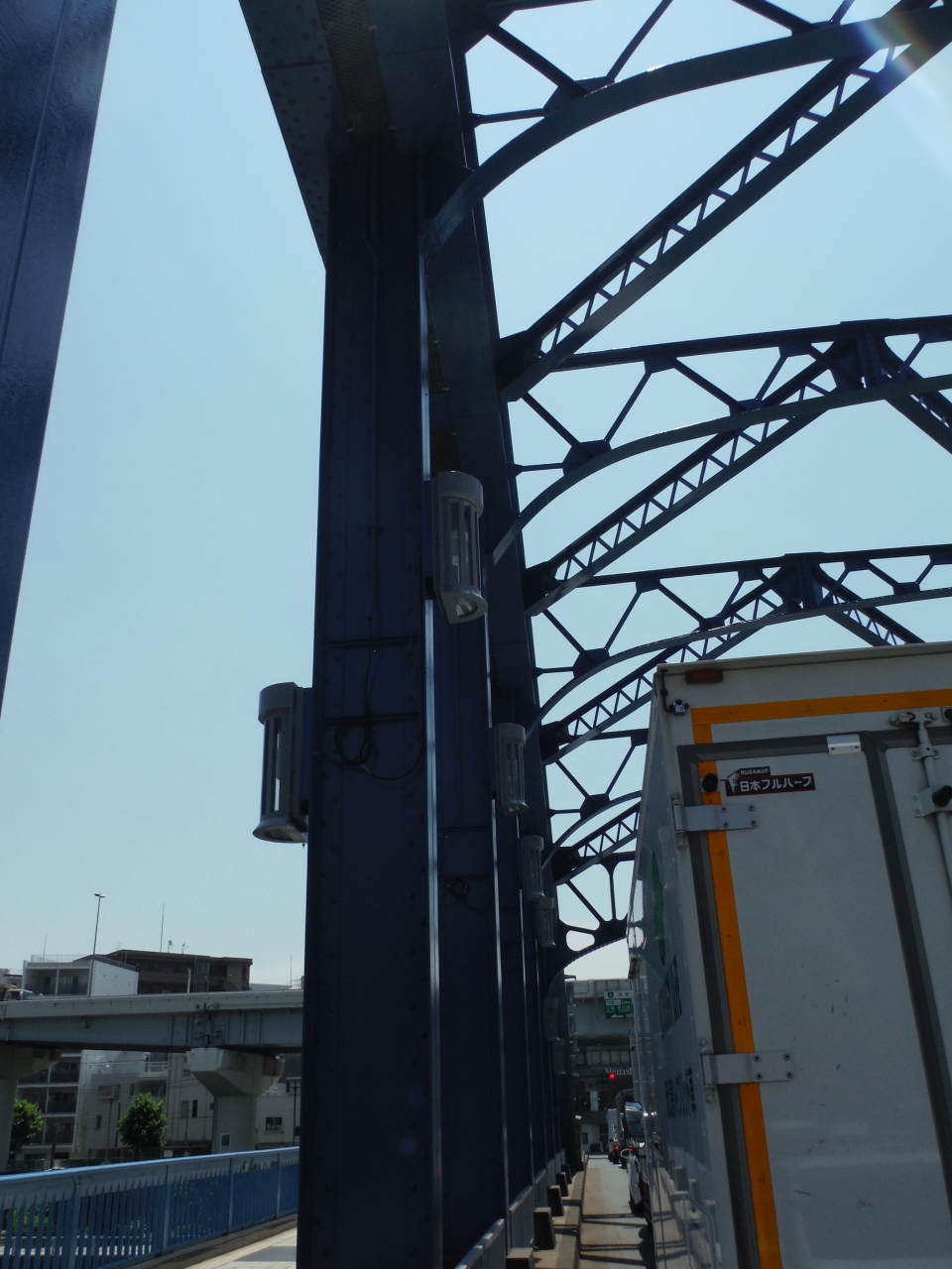 橋の上は結構混雑していました。幅員がせまく、隣に停まったトラックとの間のギリギリという感じ。