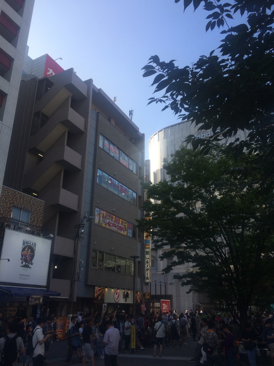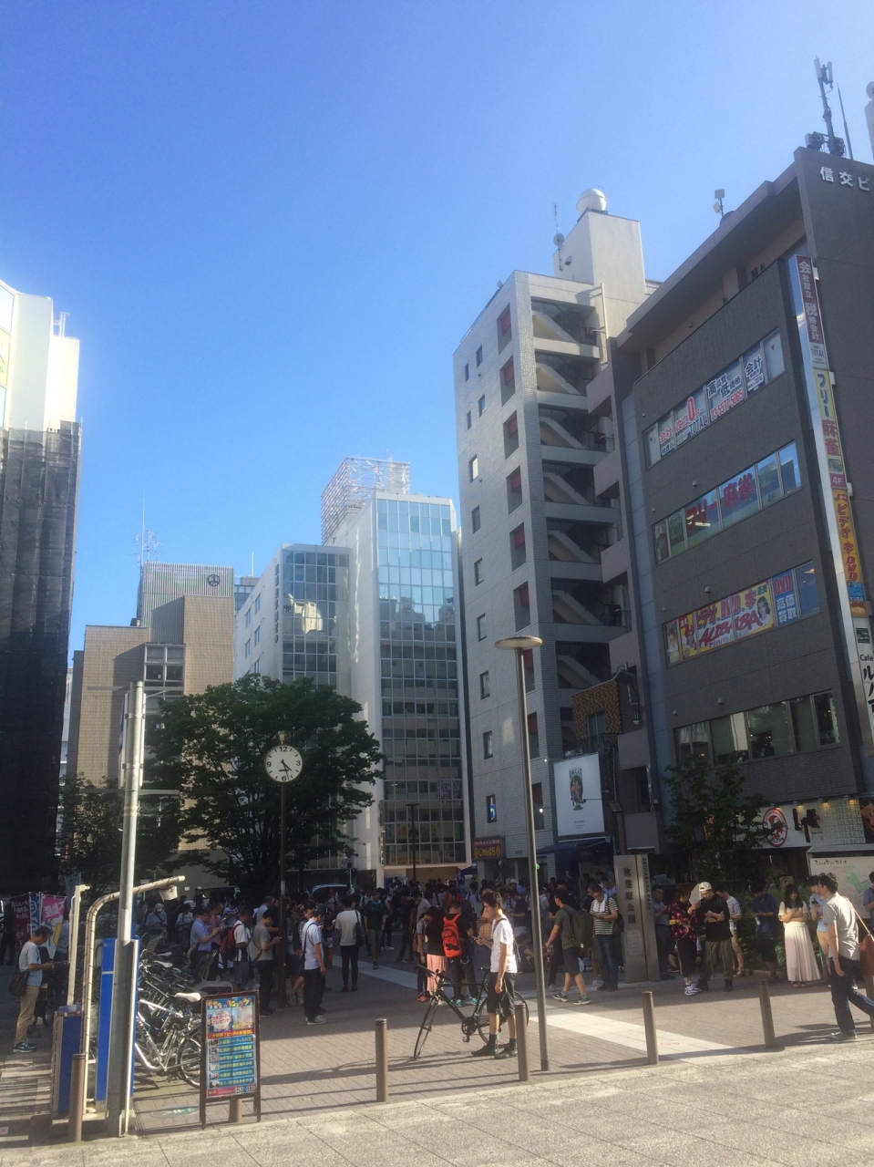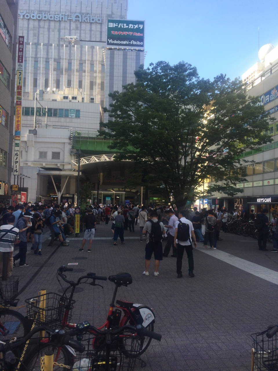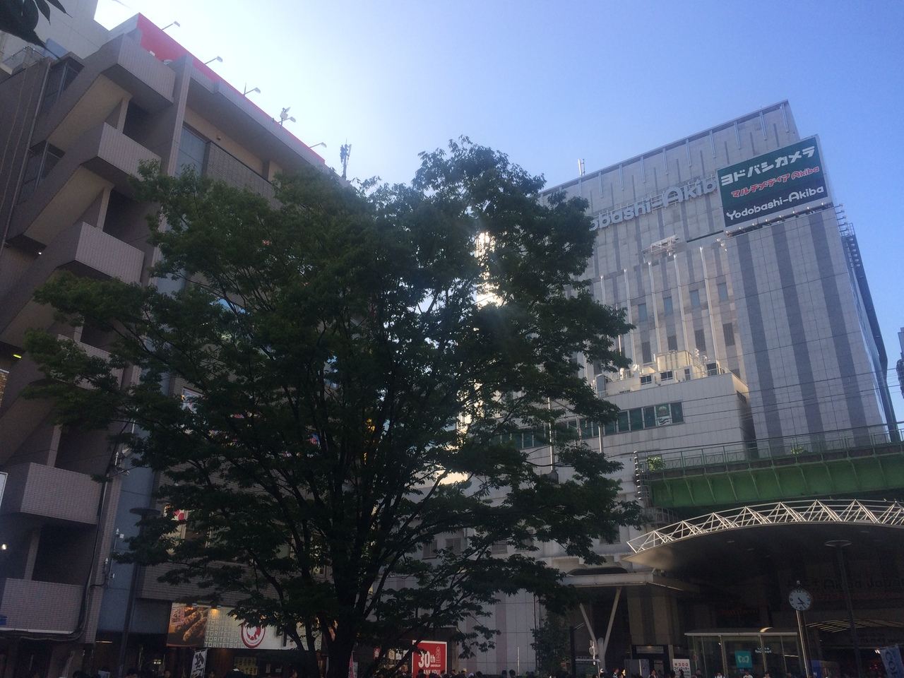 秋葉原駅前なので、待ち合わせ人で覆い尽くされ、凄い人でした。公園のイメージはありませんでしたが、大きな木が植わっていました。地面は芝生や砂等ではなくコンクリートの長方形の公園で周りをビルに囲まれています。