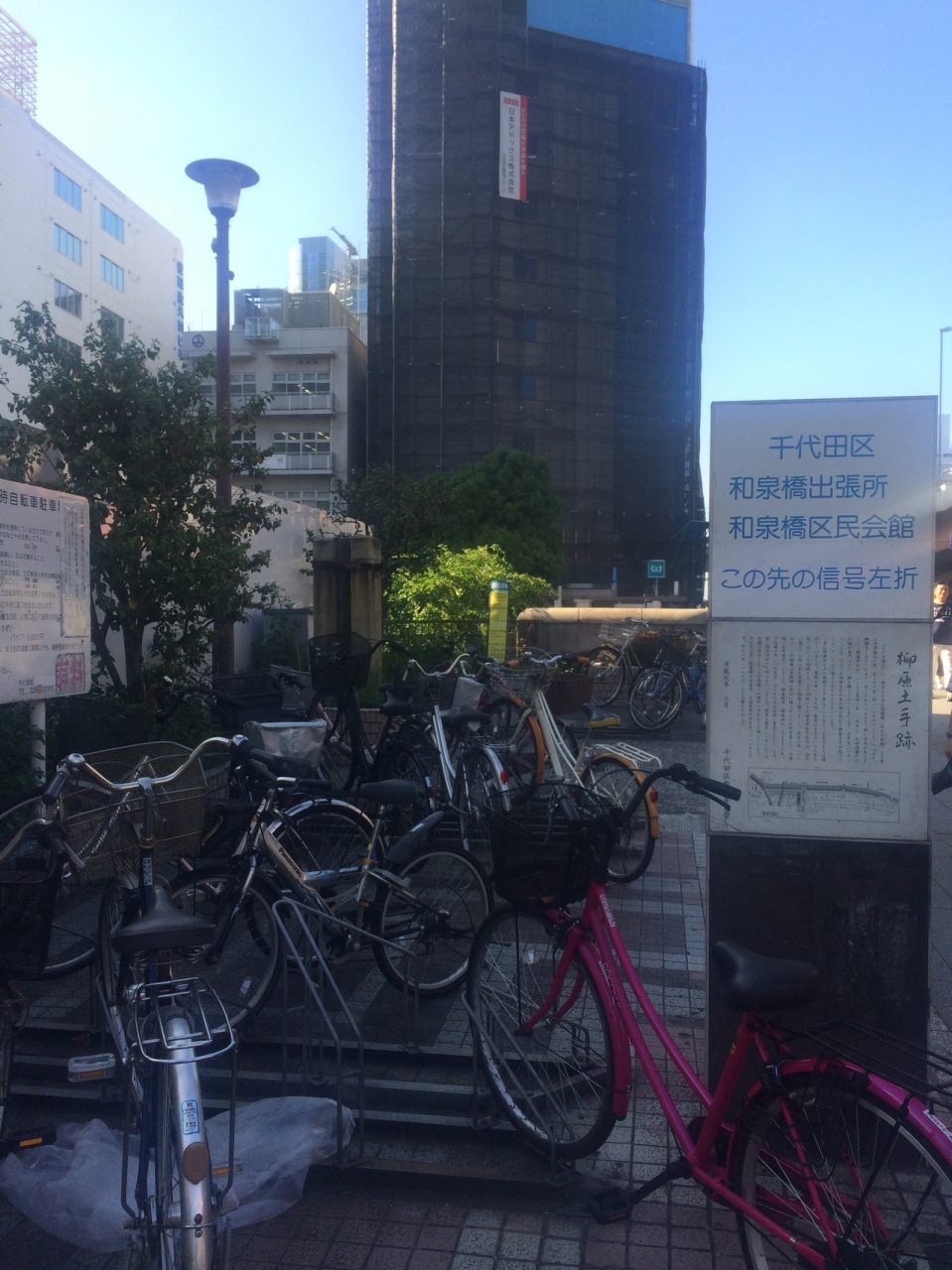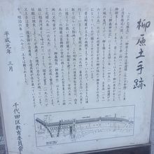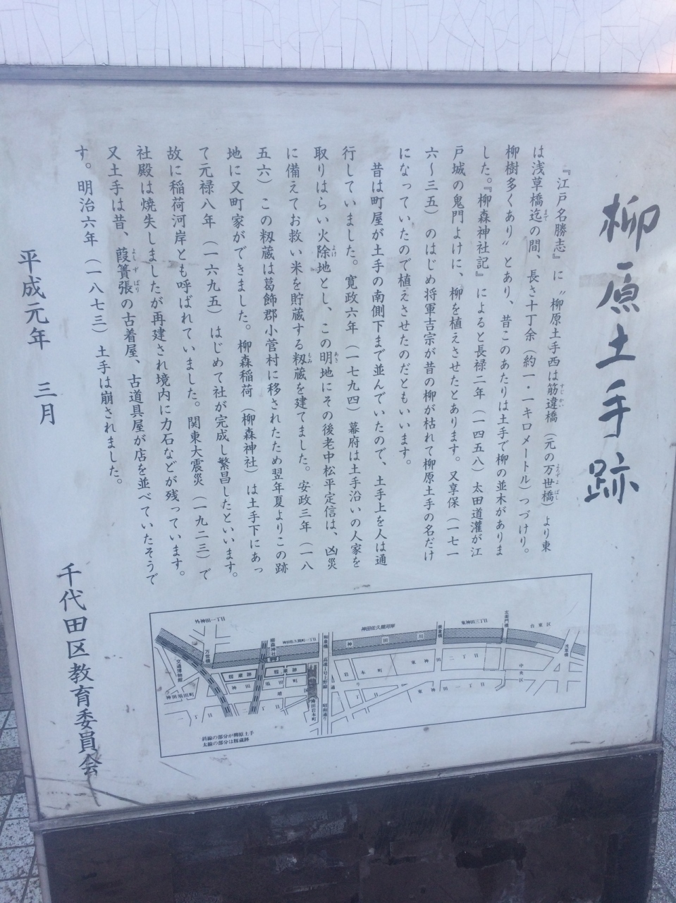 昔は1キロ以上続いた土手だったらしく浅草橋まで続き、柳が植えられていたそうです。今は、その面影もなく説明看板があるだけで通行人が多い場所ですが忙しなく通り過ぎて行きます。自転車置き場にはなっていて自転車を止める人が看板を見るぐらいです。