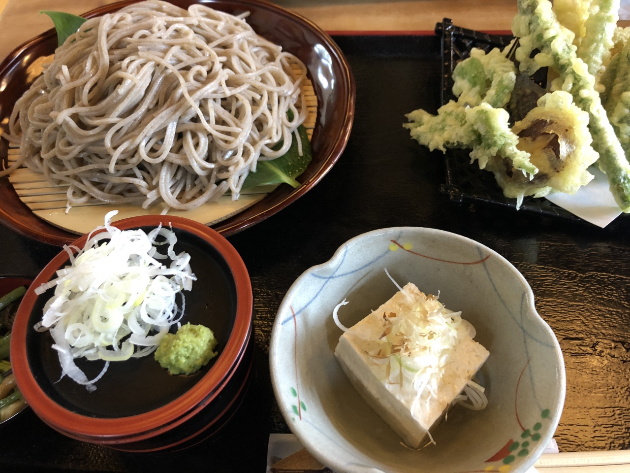 茅葺の曲り家が立ち並ぶ前沢集落の入り口に建つランドマーク的存在の蕎麦屋さん。随分立派で大きな曲がり屋の中に入ると、店員が下駄箱のところまで出迎えてくれます。天井の高い古民家で食すそばはマズマズのもので、山菜と野菜の天ぷらがたくさんついていました。