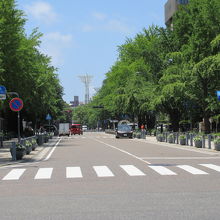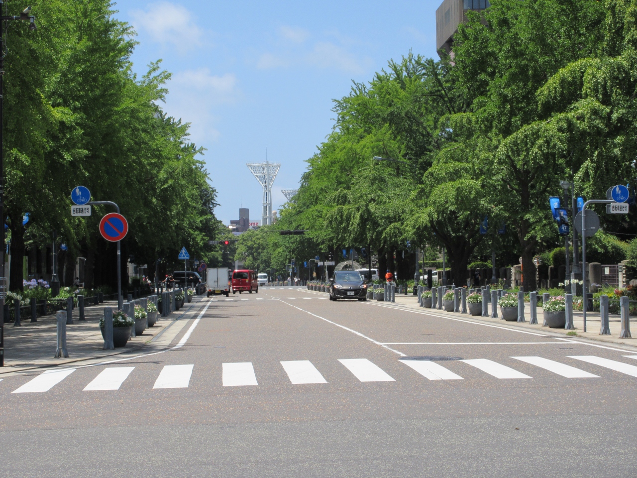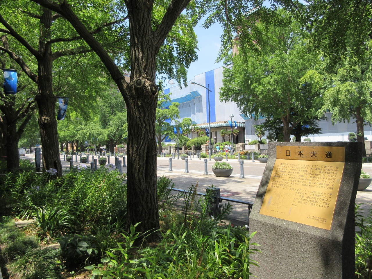 横浜公園から開港資料館まで続く、道幅が広い道路です。歩道にはイチョウ並木が続き、木の下には花が植えられた花壇が造られ、花壇の周りには金属製の椅子が設置されていて、広々とした落ち着いた空間を作り出しています。1866年に起きた火災の教訓から、火災による延焼を防ぐために造られた道路です。計画通りの道路にはならなかったようですが、十分に広く開放感が感じられる道路です。