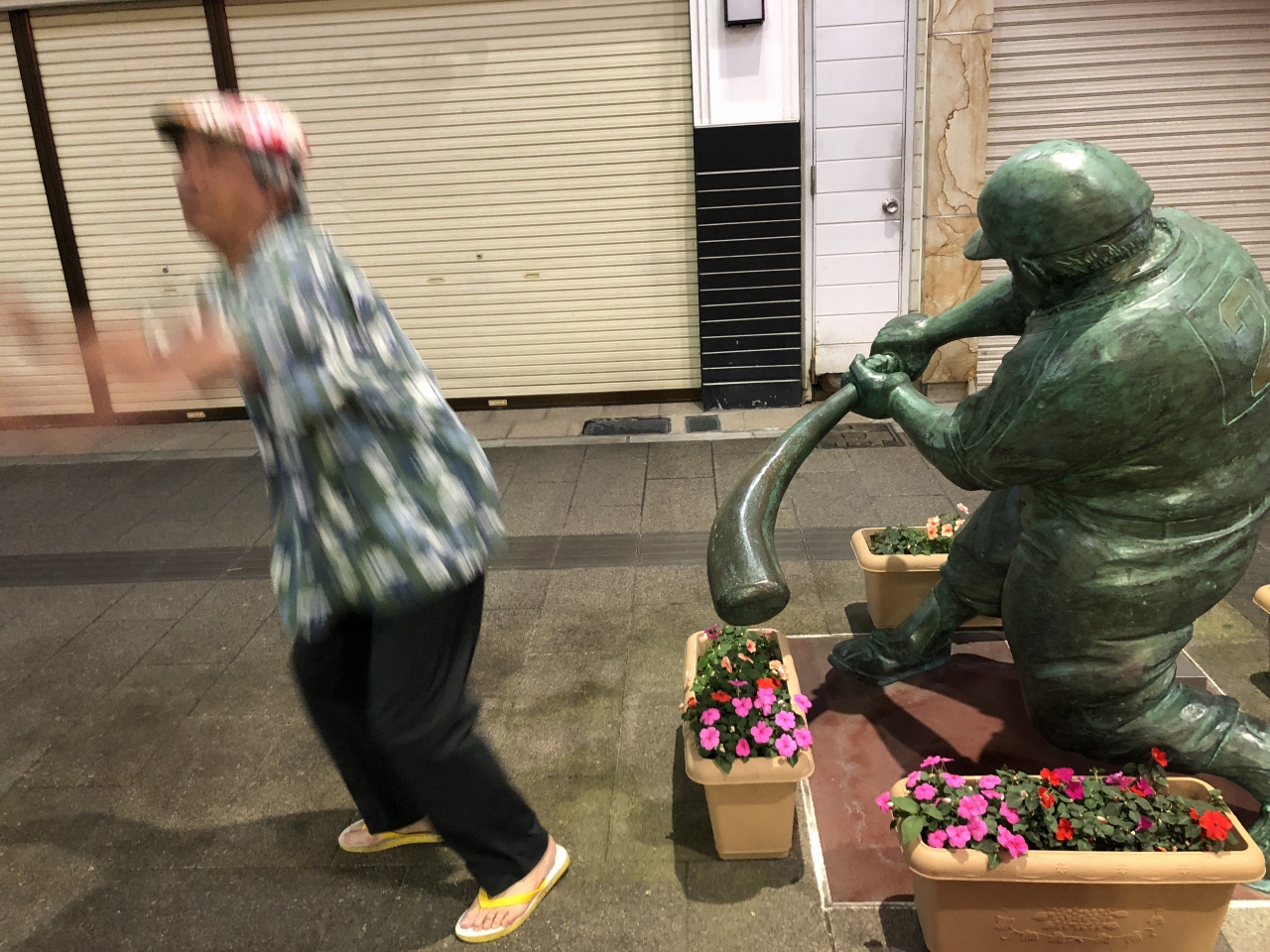 ちょうどホテルでテレビを見ていたら、ドカベンの連載が終わるが、ドカベンのフルスウィングに尻を叩かれるのがインスタで流行っているというニュースがあり、寿司を食った帰りに立ち寄って見ました。夜の古町アーケードは人影も少なく、ブロンズ像が皆寂しげでしたが、しっかり尻を叩いてもらいました。