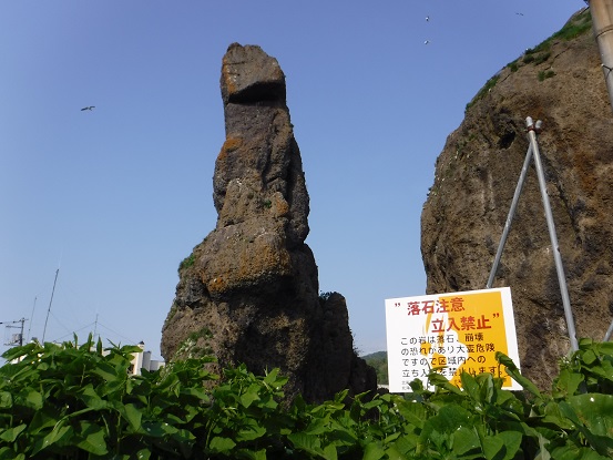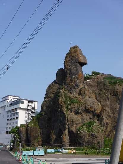 ウトロ港の入口にあるゴジラに似た岩、クルーズ船乗り場に行く途中にありました。火山噴火や地殻変動によって形成された知床半島は、奇岩や断崖絶壁に囲まれていますが、このゴジラ岩もそんな中の一つ、自然にできた形のようです。見る角度によっては正にゴジラ、正面から見るとちょっと首を傾げた姿に見えて愛らしいです。
