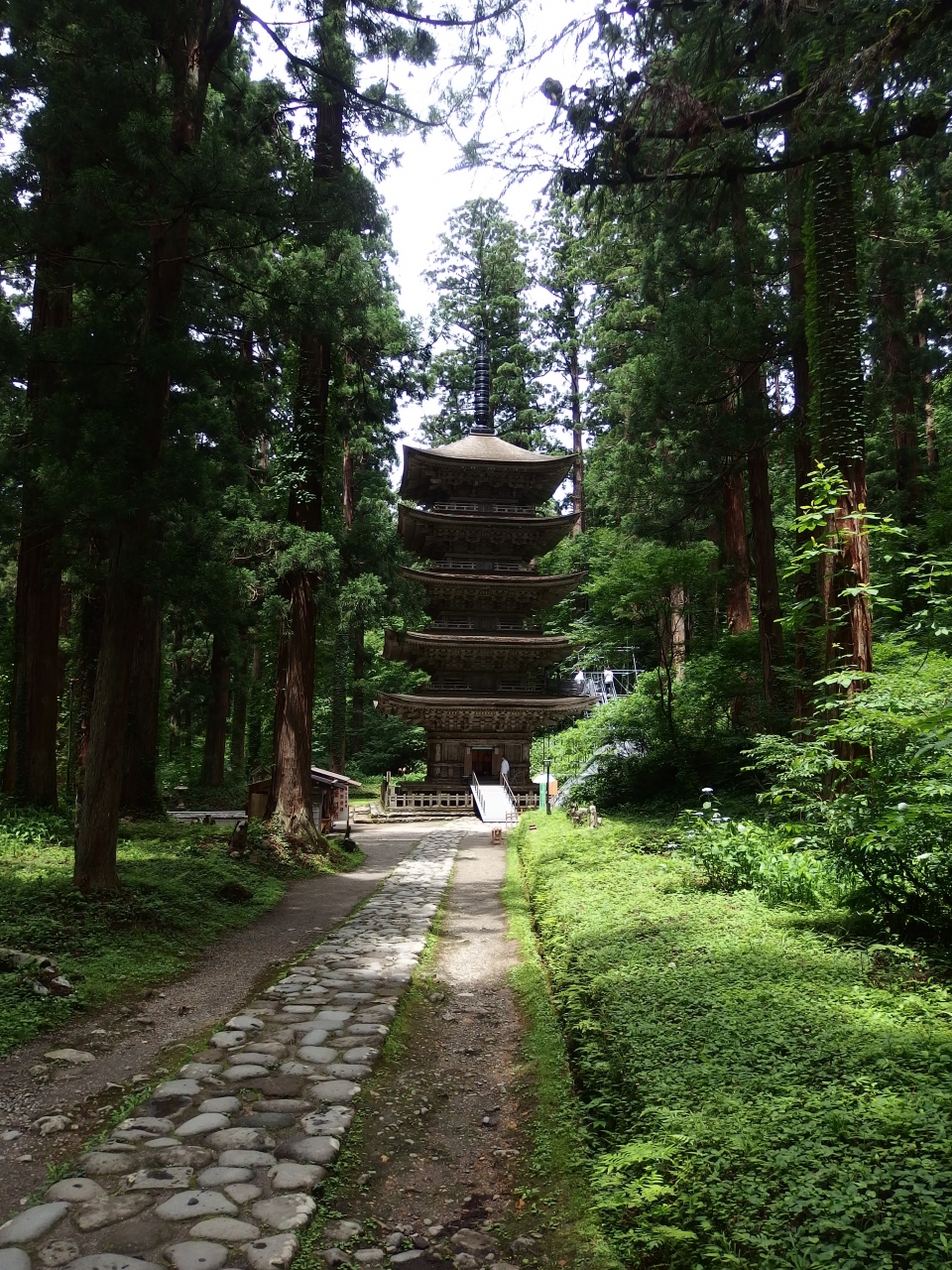 随身門を抜けて、参道に入り、石段をしばらく下ったあと、少し登ると杉の巨木の間から五重塔が姿を現します。いかにも厳しい風雪を潜り抜けてきたという立ち姿です。宗教心の無い人でも思わず拝んでしまうような光景です。2018年(平成30年)11月4日までは特別拝観ということで、内部を見ることができます。一層目の内部への立ち入りと、階段を上って2層目の中を寝転んで覗くことができます。
