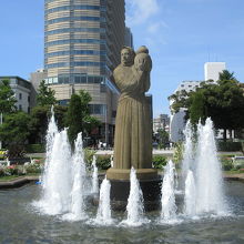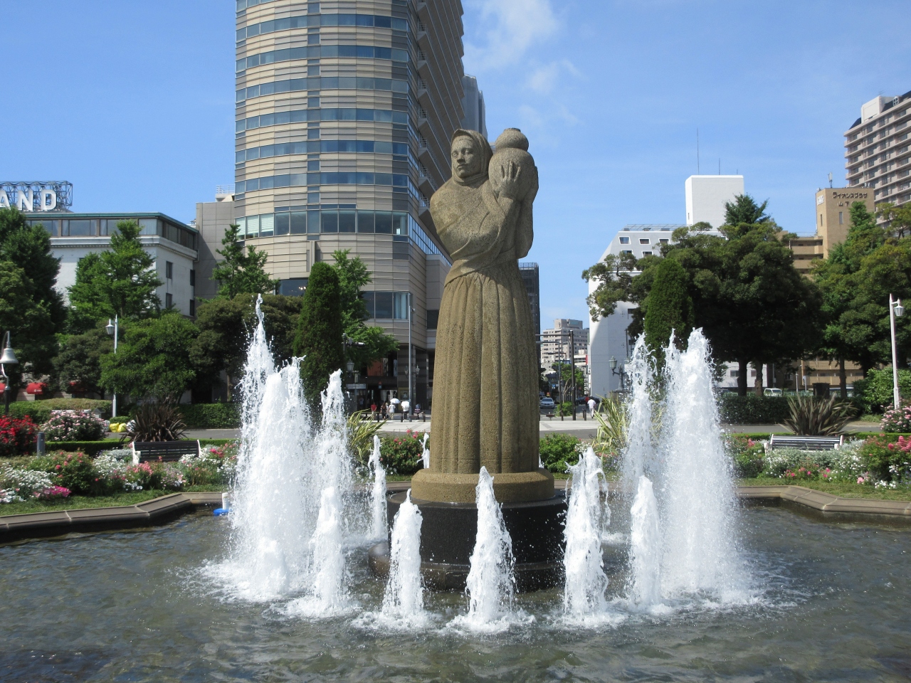 山下公園中央にある噴水の中心に立つ像です。横浜の姉妹都市アメリカのサンディエゴから寄贈されました。水の守護神を囲むように低い噴水が出て、噴水池を囲むバラなどの草花も含めて一つの作品のように思えました。夜になるとライトアップされます。噴水池を囲む歩道の周りにも手入れされた花壇が囲んでいて四方にサンディエゴから贈られた4基のミッションベルが置かれていて、この一帯をサンディエゴ友好の泉と呼びます。像だけではなく噴水と花壇も含めて見どころです。
