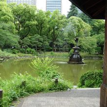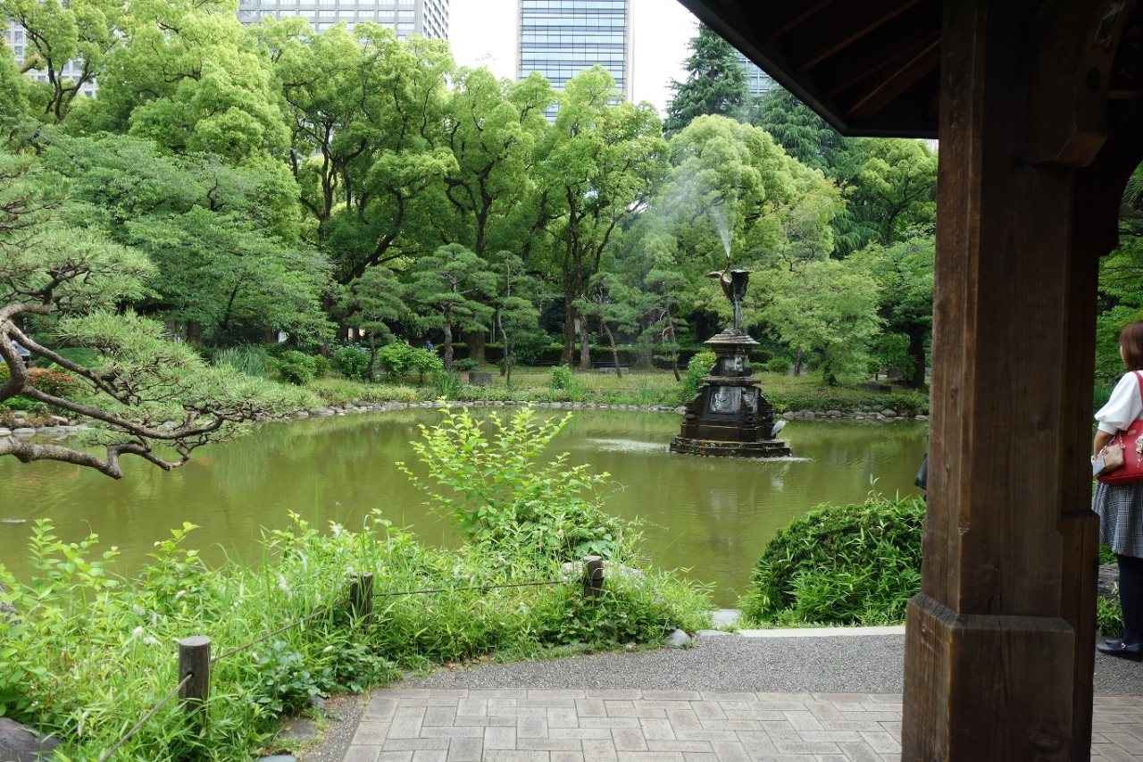 都会の真ん中にある大きな日比谷公園は緑が多くて爽やかですがここ雲形池の周囲は特に涼しさが感じられるエリアです。池の中には鶴の噴水が有って美しい景色を演出しています。散策する人たちがのんびり歩いていて癒されました。