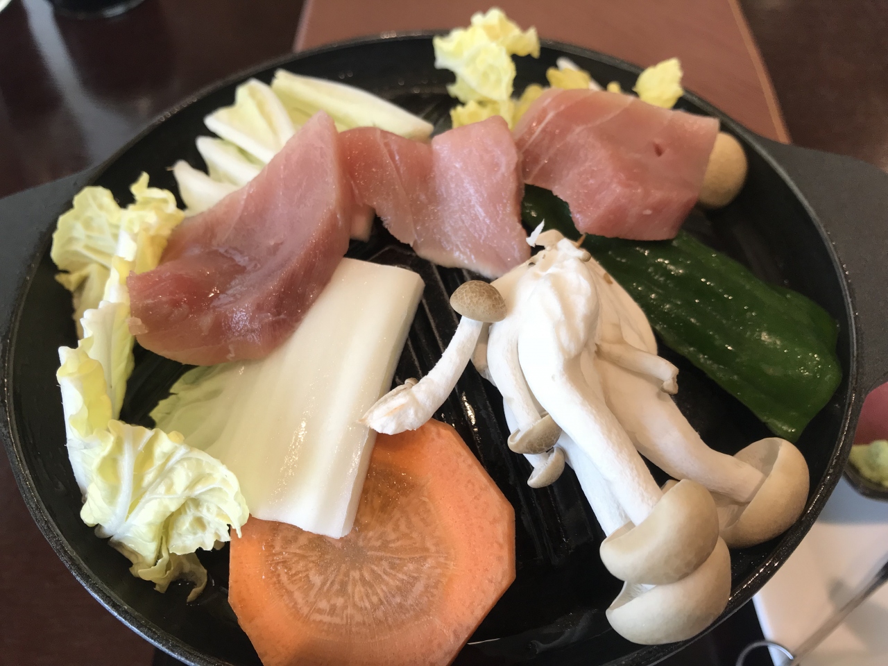 ・マグロと野菜は一人用ジンギスカン鍋で焼いてもらうマグロを焼く時は、鉄串からマグロを抜いてジンギスカン鍋にのせてもらう