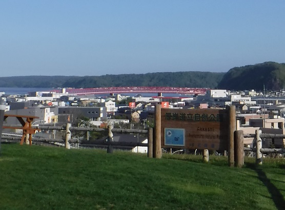 浜中駅前から霧多布を経由して厚岸駅前まで路線バスで移動した際に、厚岸大橋を渡りました。二つの市街地を繋ぐ赤い大きな橋は、遠くからでもとても目立ちます。長さ456mのこの橋は昭和47年に造られ、それまではフェリーボート、その前は渡し舟が行き来し、冬になると流氷や海面が凍りたびたび欠航されたそうなので、この橋は町の発展に大きく貢献したようです。厚岸グルメパークからも一望でき、赤い橋が青い空と海によく映えてました。