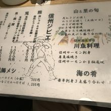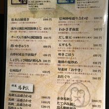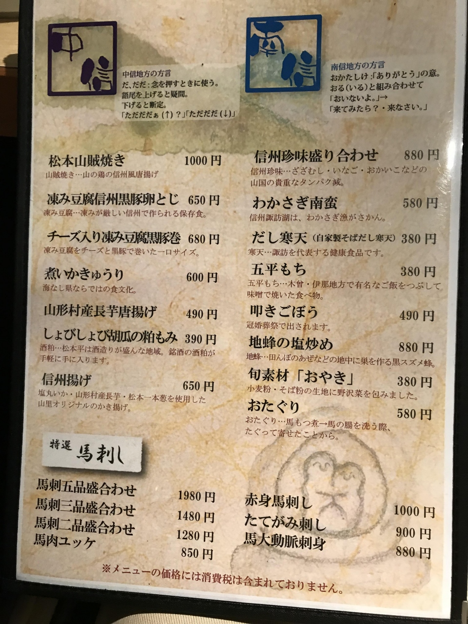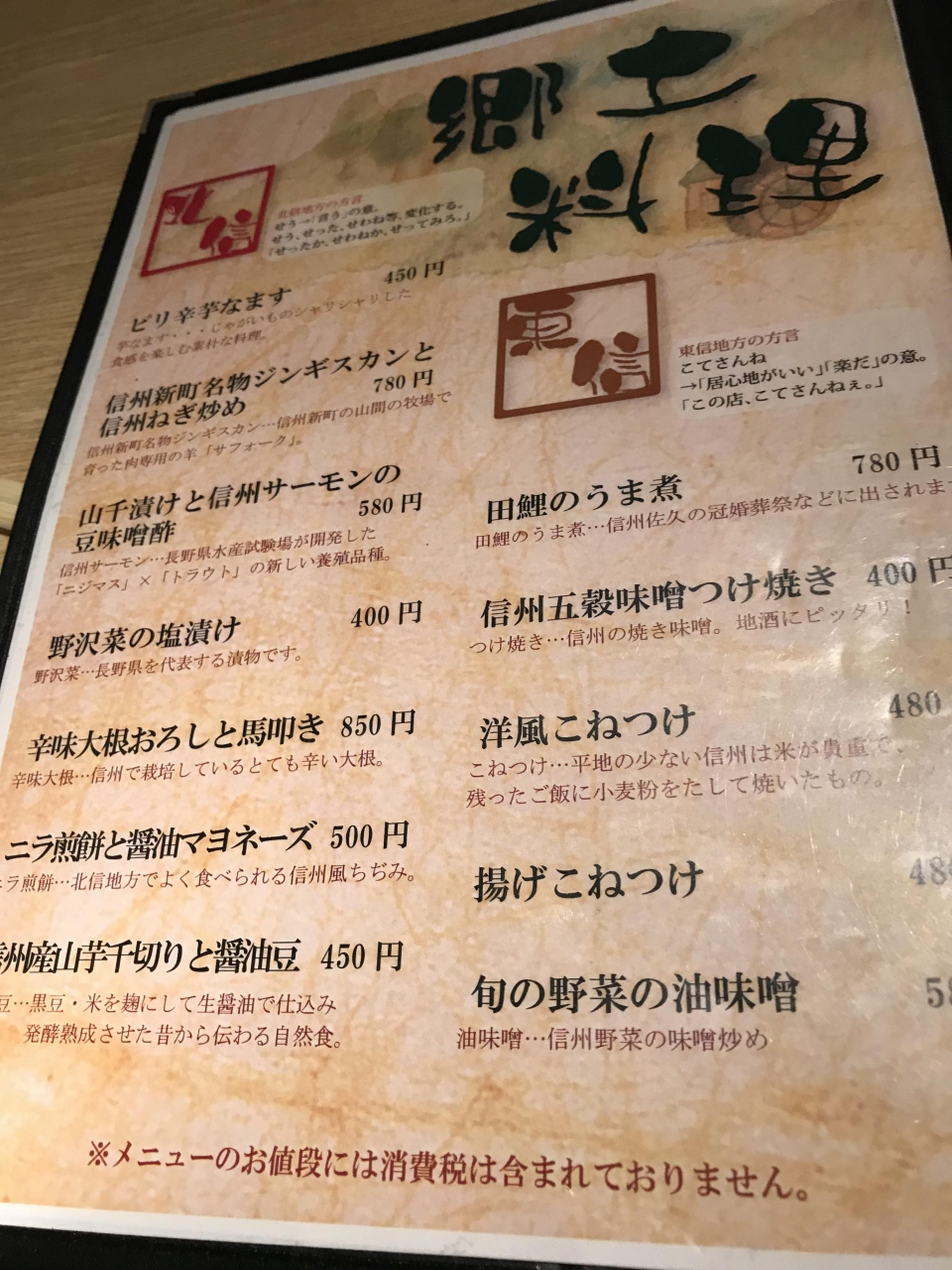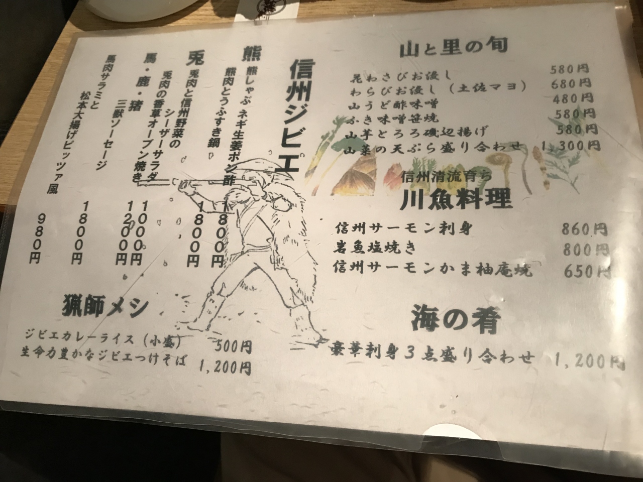 この店は、地元のジビエ料理をはじめ、信州各地の郷土料理や信州地酒が多数オンメニューされていて、観光客、地元の人たちともどもに人気があり、ネットでの市内居酒屋ランキングではトップクラスの居酒屋。