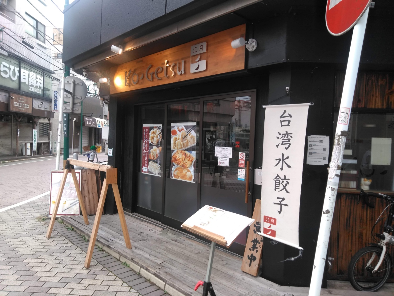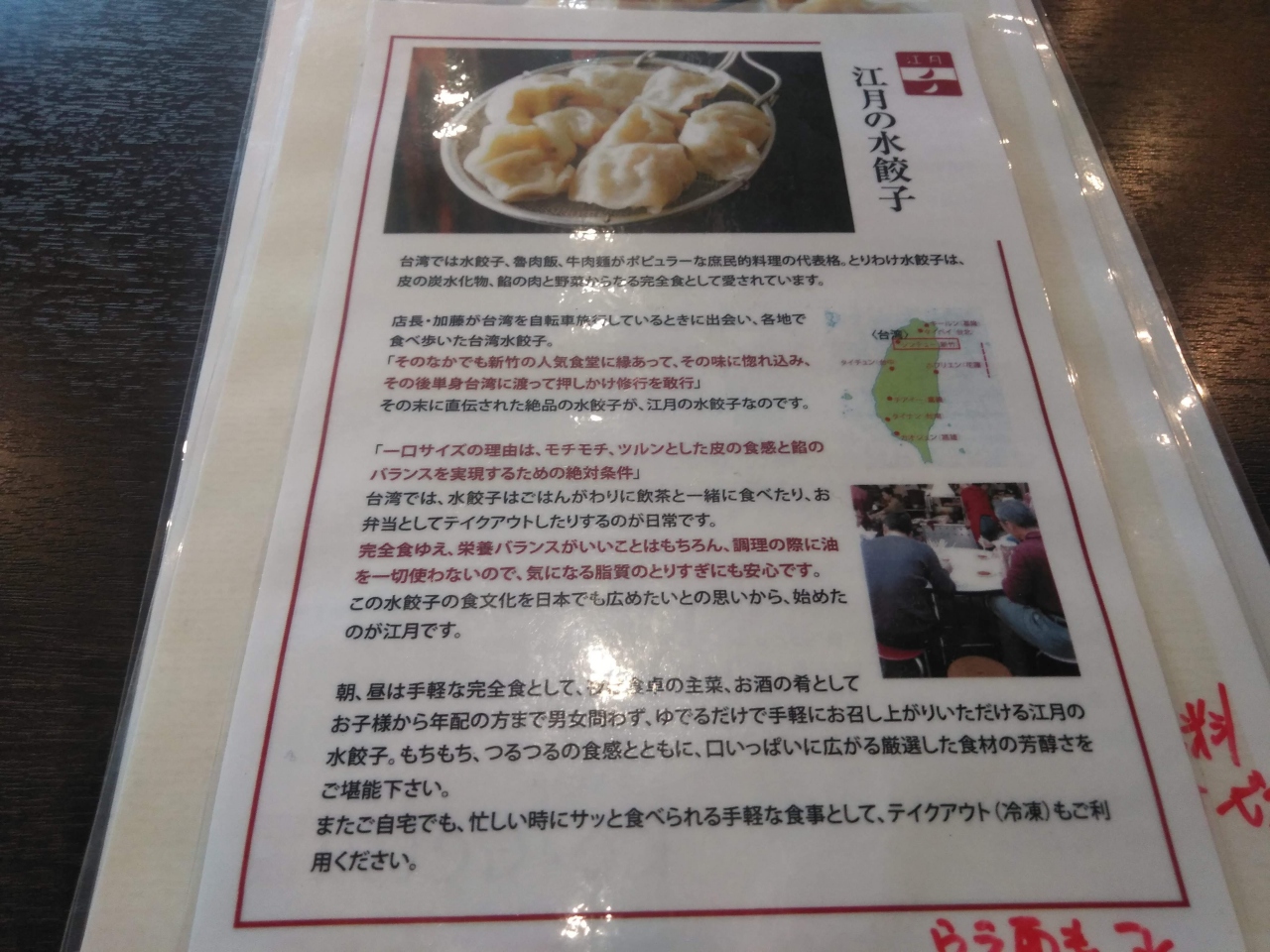 お店の前には、ロード自転車を停めることがある木のバーがあります。店主は自転車乗りのようで、この江月(Ko-Getsu)も台湾を自転車で旅をして水餃子にであって開いたようです。自転車乗りには良いお店のようです。