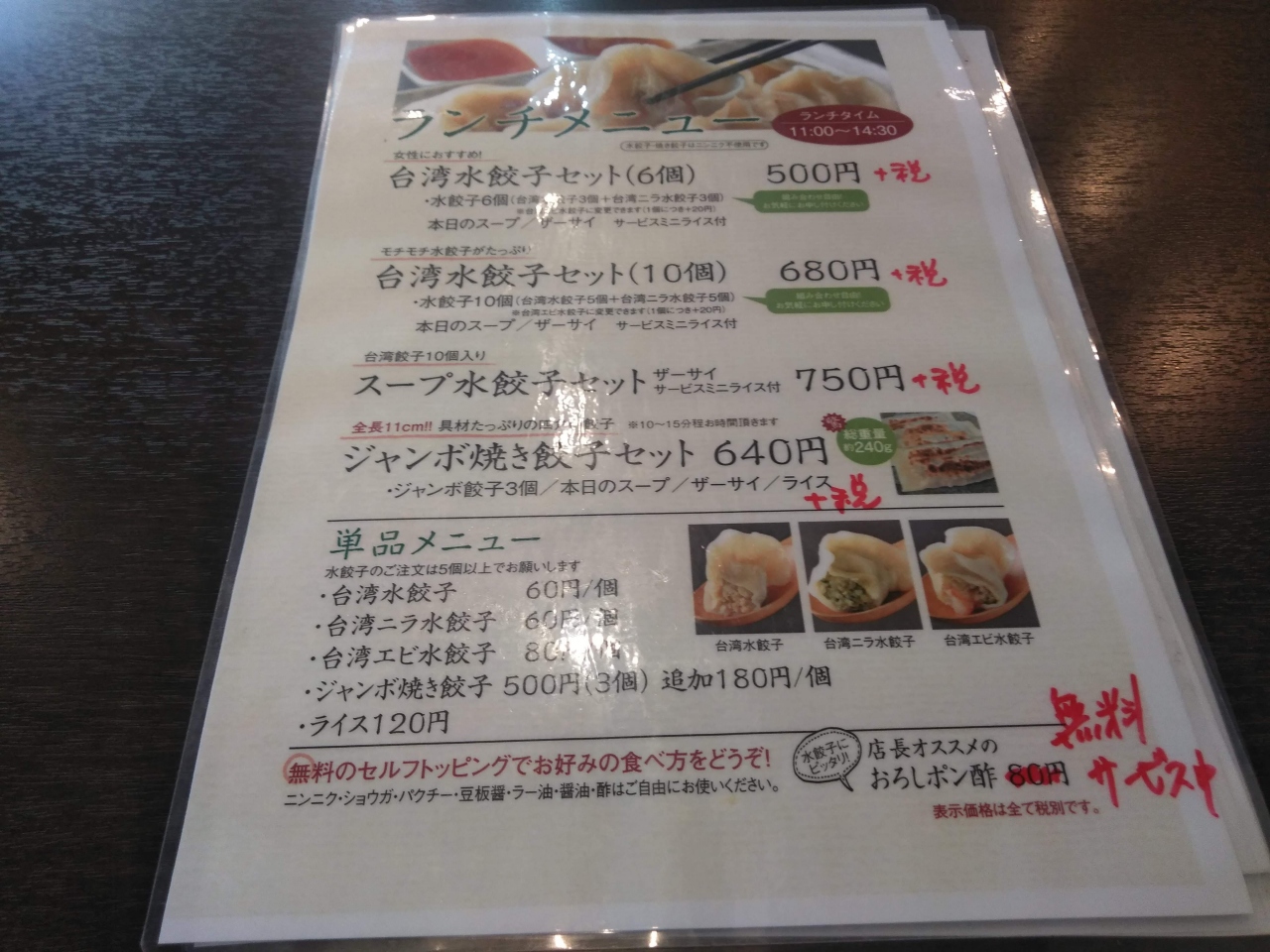 ランチの時間に訪問、ランチメニューのセットメニューがありました。台湾水餃子セット(6個)を食してみました。サービスミニライス付きでしたが本当にミニです。男の人なら10個のメニューがおすすめかもしれません。水餃子は焼餃子と違ってモチモチして美味しかったです。