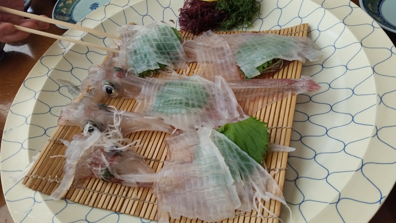 日帰りバスツアーの早目の夕食で訪問しました。イカの活き造りが出され、各自の皿に取った後、頭と足は天ぷらになってまた、出てきました。いかしゅうまいやイカのもろみ漬けなど、イカ尽くしの料理が美味しかったです。