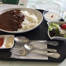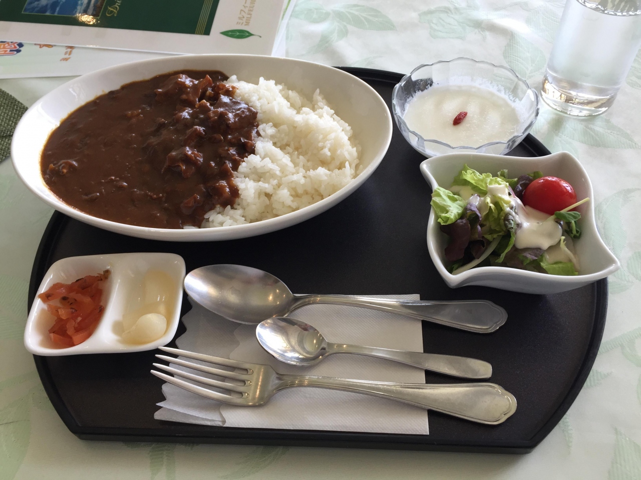 今回のプレーは昼食付きプランでした。メニューによってはプラスの追加料金が発生しますが、追加料金のないカレーを注文しました。個人的に定番のメニューで、他のゴルフ場に行ったときも、決まってカレーを選択しています。理由としては、ほぼハズレがないことですね。こちらのカレーも思った通り美味しかったです。サラダと杏仁豆腐のデザートも付いてきて、お得感もありました。