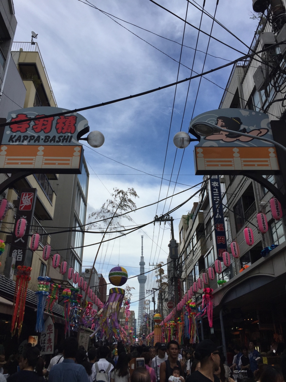 かっぱ橋道具屋筋は10月の 道具屋筋まつりが有名ですが、今回は、浅草六区の西から道具屋筋を横切り上野にかけて約1キロ続くかっぱ橋本通りを会場とする [下町七夕まつり]開催中でした。道具屋筋も協賛セールをされているお店も多く、お得にお買い物出来ました。