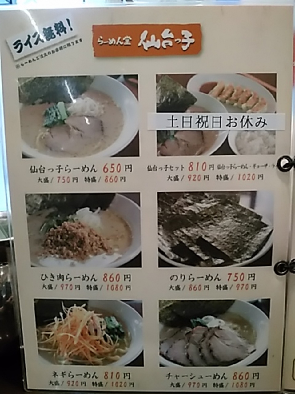 今は閉店したさくら野百貨店の裏側で、ペデストリアンデッキの下からとアーケード側から入れます。ラーメン頼むとライス無料です。一番人気は仙台っ子ラーメン650円のようです。トンコツ醤油に中太麺がいい感じでした。
