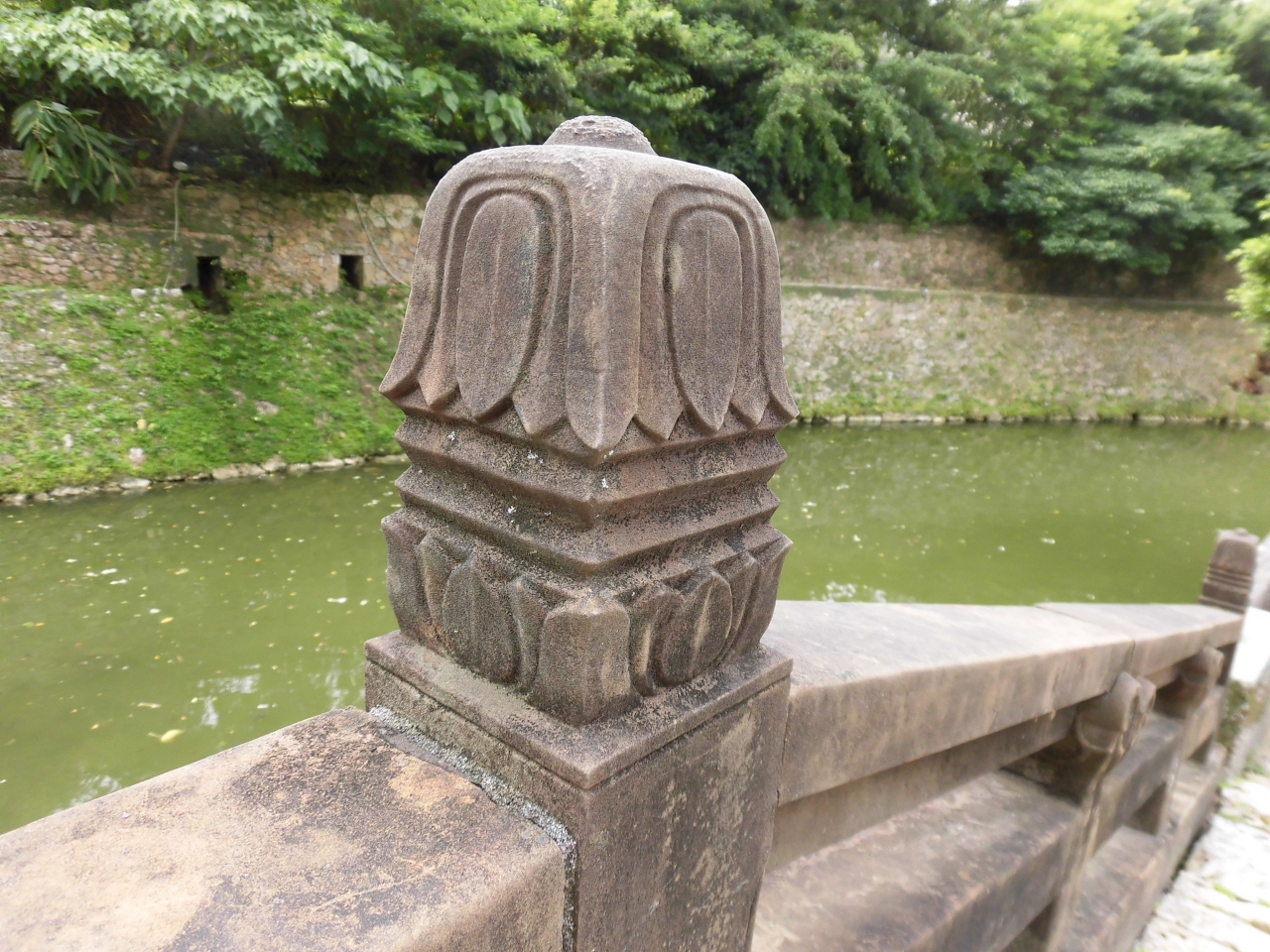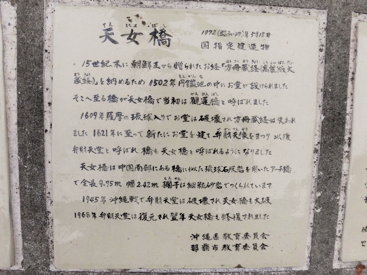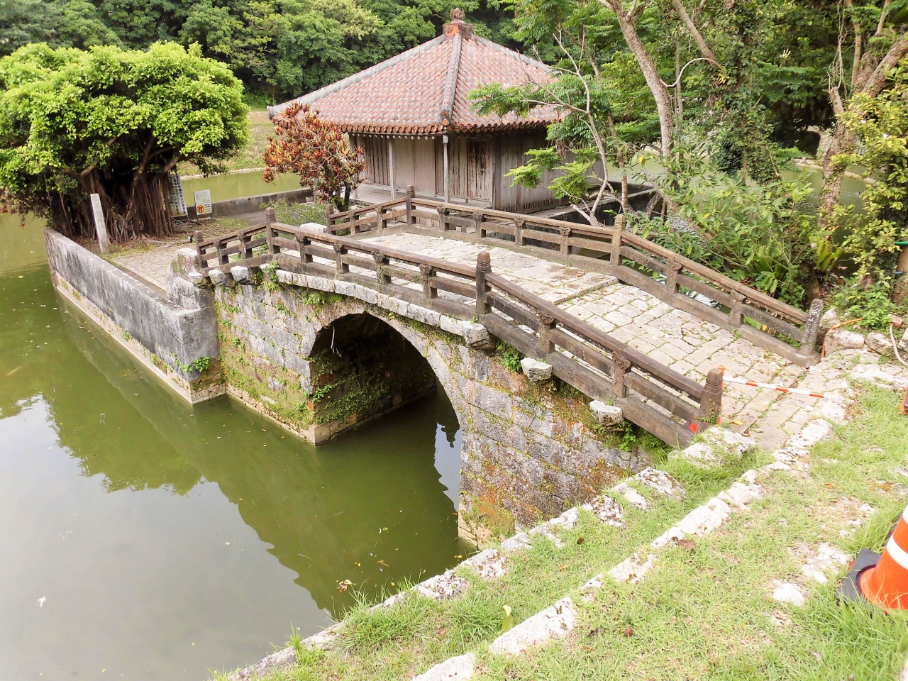首里城の見学コースの出口から近いです。「円鑑池」にある「弁財天堂」にかかるに架かる小さめの石造アーチ橋で、国の重要文化財に指定されています。別名、観蓮橋とも呼ばれています。石の欄干には蓮の彫刻等も施されていて、思わず写真を撮りたくなる橋です。