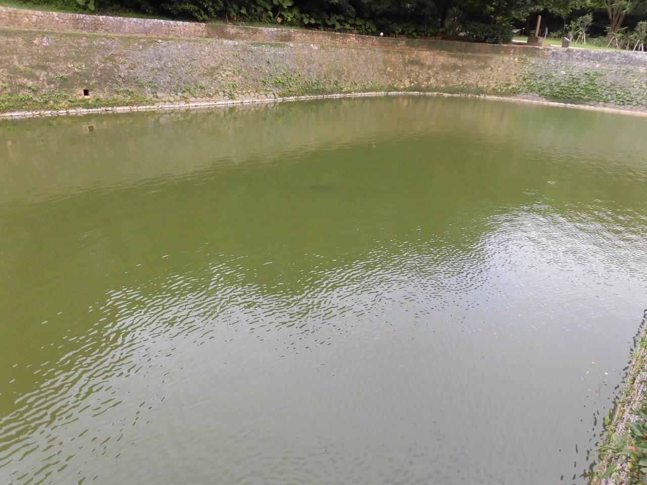首里城の見学コースの出口から近いです。首里城からの湧水や雨水が集まる仕組みになっていて、ここからあふれた水が隣の池「龍潭」へ流れています。この池自体の見所はありませんが、池の中央にある「弁財天堂」と、そこに架かる「天女橋」とセットで見ると、美しい景色になります。「円覚寺跡」側から見るといいです。