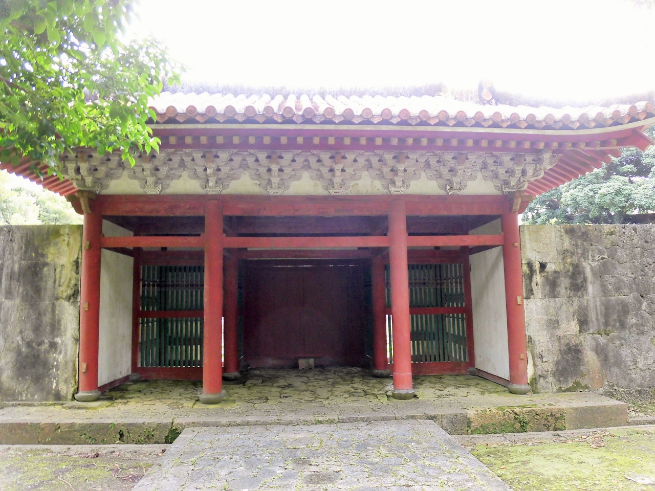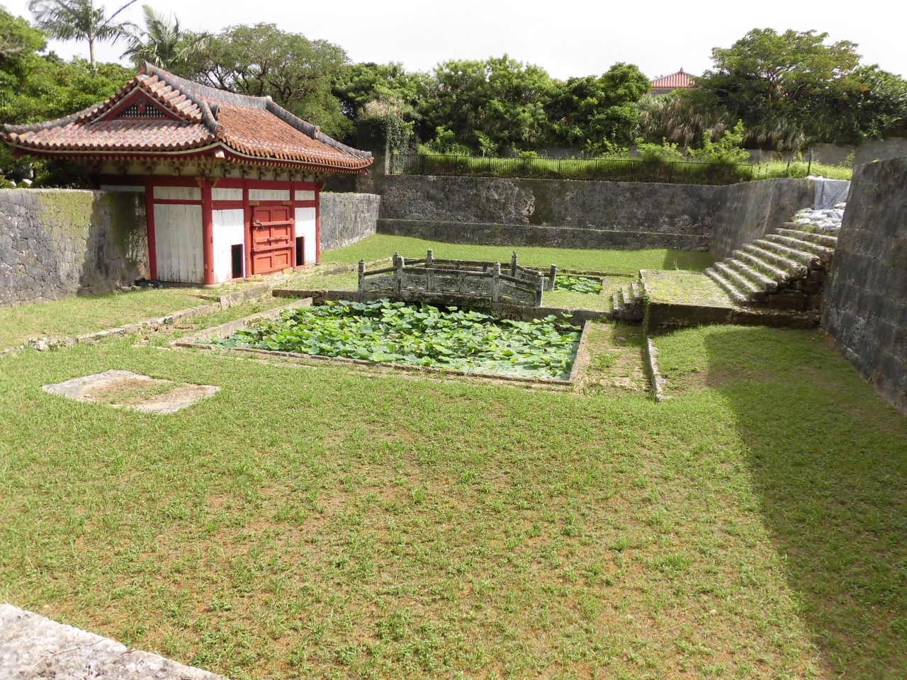首里城の見学コースの出口から近いです。現在沖縄戦で破壊されたものを復元中ですが、総門とその両側の石垣、右脇門、放生池が復元されました。門は入れませんので、横手に回ると内側を見れます。内部の小池にかかる放生橋は往時のもので、国指定重要文化財となっています。でも誰もここを見学に来られていませんでした。貴重な写真になるかも。