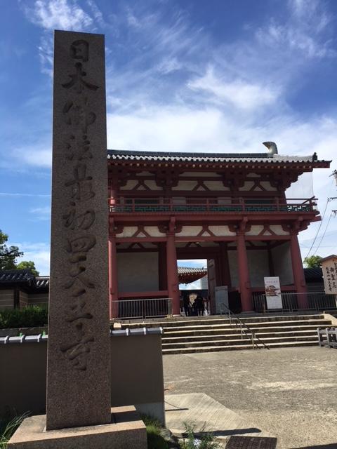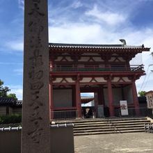四天王寺へ地下鉄の天王寺駅から歩いて行きました。歩いて15分ほどで1回左折するだけなので、道に迷うことはないと思います。途中、庚申堂に立ち寄りながら進んで行くと、信号の向こうにこの南大門が見えました。くすんだ朱色の四角い門です。バックに五重塔が重なり、より立派に見えました。