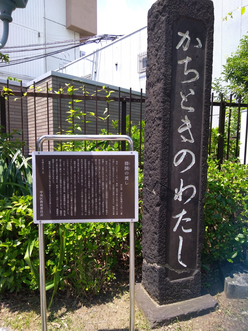 かちどきの渡しは、1905年から、かちどき橋が完成した1940年まで運行して、地域住民の生活、地域経済の発展に大きく寄与してきました。今では、写真の説明板が人通りの少ない道にあるのみです。 この説明版を見逃しやすいので気をつけてください。