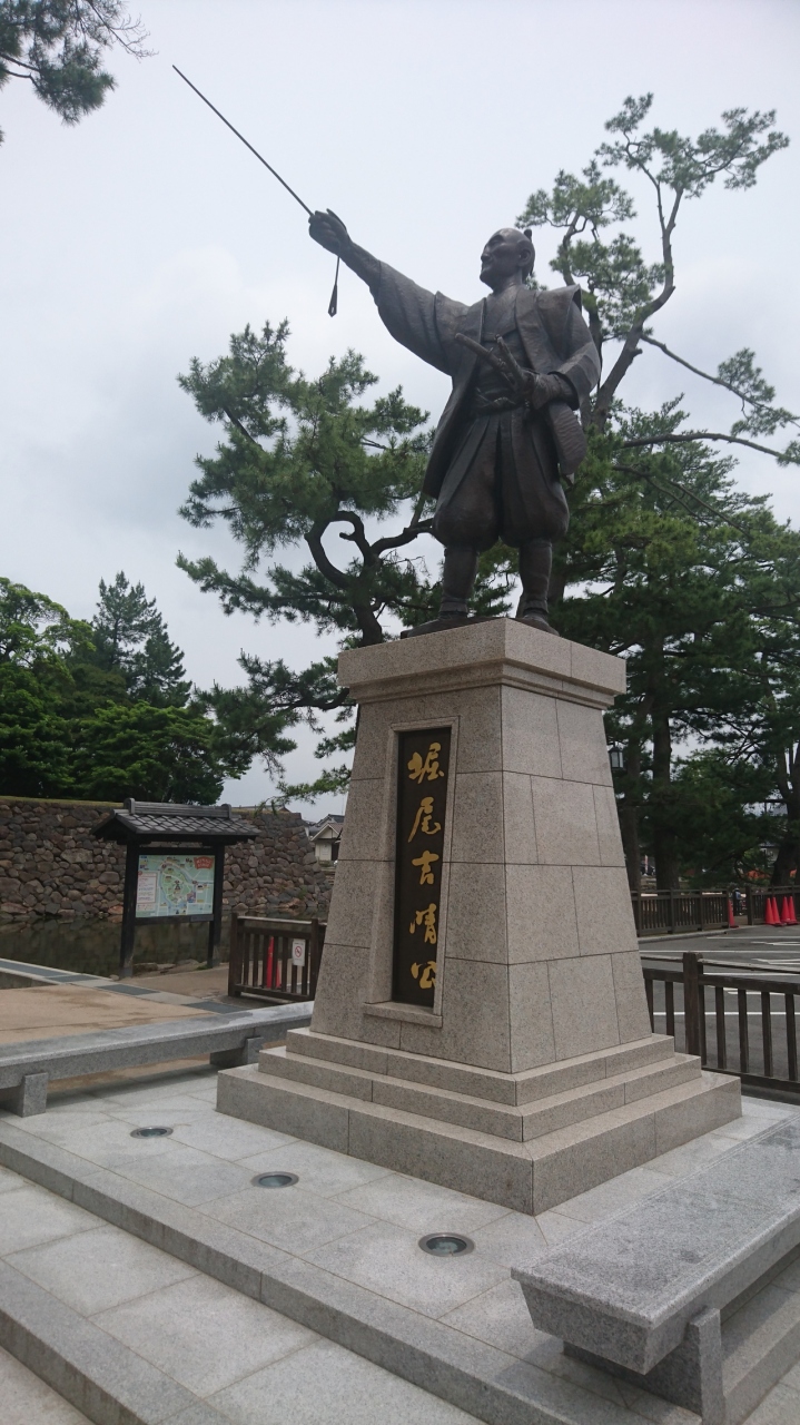 松江城の大手木戸門跡と大手前駐車場の間に、関ヶ原の武功で出雲に封じられた堀尾吉晴の像がありました。愛知県生まれの堀尾吉晴は、この地で松江城の築城と城下の造成に尽力しました。その功が今も地域に讃えられているのが像を見るとよくわかりました。