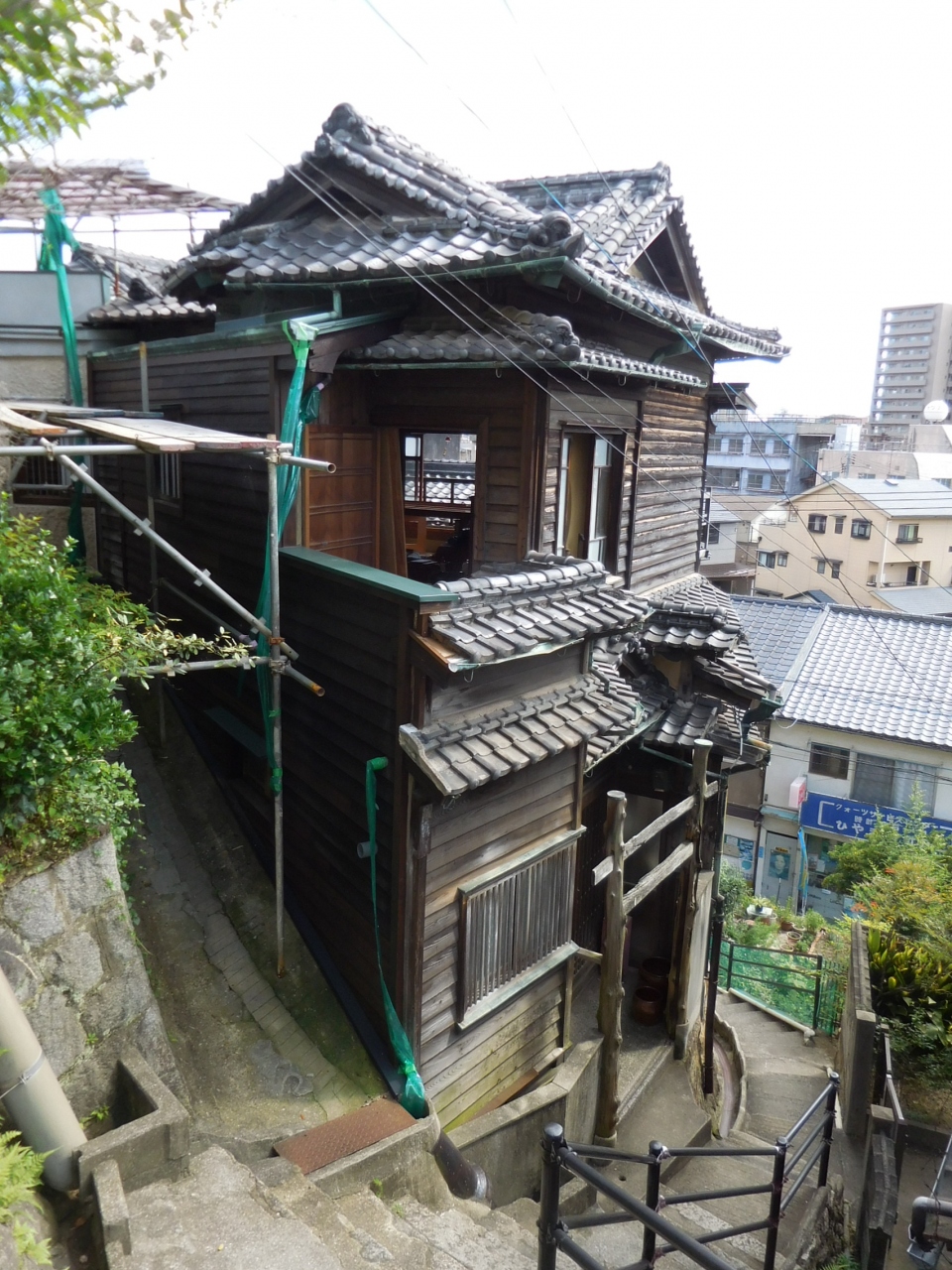 尾道独特の急な階段と坂道の細い道を登った途中にありました。狭い土地に必要以上に複雑な建築を作ってしまった感じがなんとも良い雰囲気です。
