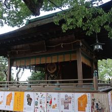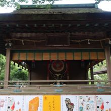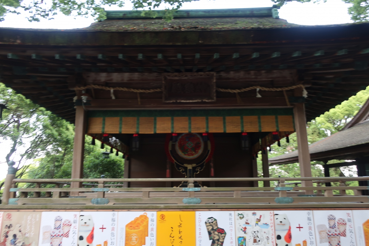 金刀比羅宮の御神木を挟んで御本宮の反対側に神楽殿があります。檜皮葺き、入母屋造りの舞台の上には神楽に使う太鼓が置かれています。由緒ある建物なのに神楽殿の下側裾部分には金刀比羅宮の御守りの宣伝と言うかポスターが囲む様に貼られており、商売根性丸出しで幻滅しました。