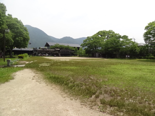 中央児童公園は、JR由布院駅から15分くらい、湯の坪街道の商店街にあります。このあたりはとにかく昼間は観光客でごったがえしているのですが、ここの公園の中に入るととたんに静かになります。椅子があまりないせいか。公園内で食事をする人も少ないので喧騒からはしばし離れられます。また、戦前に造られたという園内のSLも目を引きます。