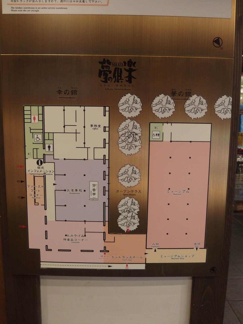 酒田市で一番の観光施設、山居倉庫にある観光物産館です。明治時代につくられた米穀倉庫である「山居倉庫」の現存する12棟のうち、一番南側の2棟を改造して使用しています。観光案内所と地元工芸品を展示するミュージアムの他、土産物店とファーストフード店と和食レストランがあります。外見はもちろん内容もなかなか充実しており、ここに来れば大抵のおみやげは揃います。また、隣に地元農協の農産物直売所と地元酒屋の地酒専門店が入っている建物があり、こちらも併せれば酒田のものはすべて揃います。