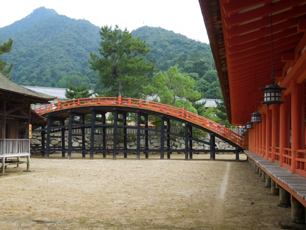 ホームページの開設によるとかつては重要な祭事の際に勅使がこの橋を渡って入って来たそうです。見たところ橋の傾斜がかなり強くて、普通では歩けそうもありません。現在の橋は、弘治3年(1557年)に毛利元就・隆元父子によって再建されたものらしいので、以前とは少し違うのかもしれません。