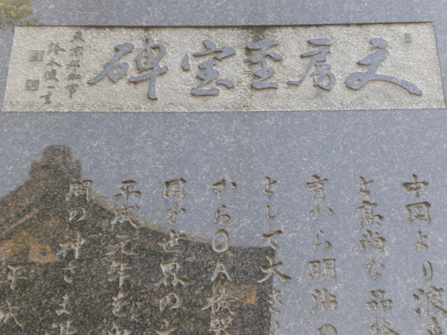 文具至宝碑は、黒色の大きな石碑で、周囲を圧倒するような高さです。